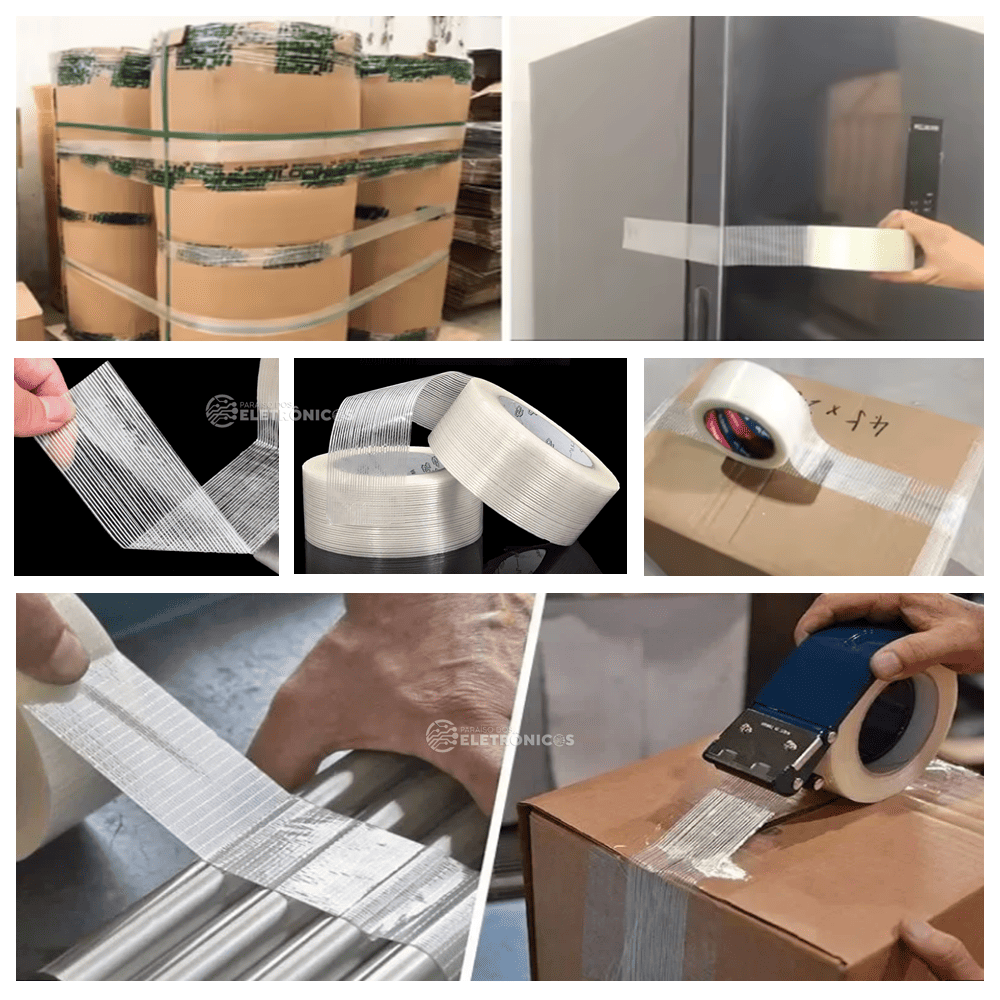Fita de fibra de vidro de malha transparente, resistência mais forte do que a fita transparente comum, viscosidade mais forte, pode ser usada para bandagem pesada de metal, embalagem e caixas de vedação ou amarrar objetos pesados.