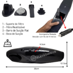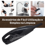 O equipamento apresenta cabo elétrico longo com 4 metros e não dá trabalho nenhum para usar, possui compartimento traseiro para guardar o fio. O aspirador de pó portátil vem acompanhado de uma boca de sucção e um bico extensor de sucção para acesso aos locais mais difíceis. Possui também botão liga desliga. O filtro pode ser facilmente removido para limpeza.