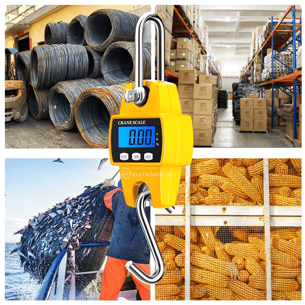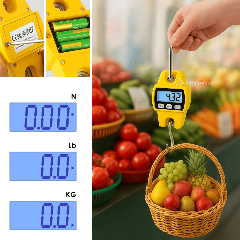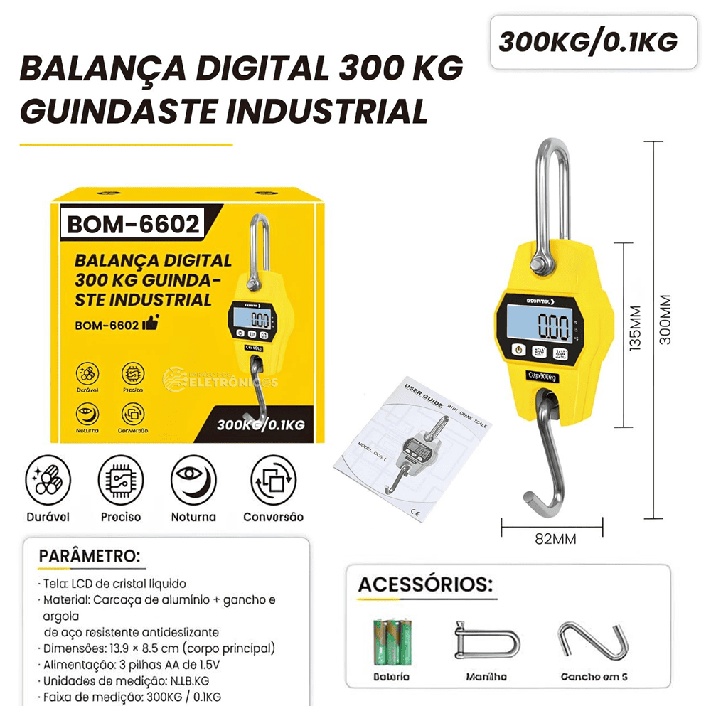 Fabricada com carcaça de alumínio resistente e gancho em aço, a balança suporta até 300 kg com precisão de 0,1 kg, oferecendo resultados confiáveis a cada medição. Funciona com 3 pilhas AA, possui função tara e desligamento automático, o que garante baixo consumo de energia e alta durabilidade. Além disso, acompanha ganchos e manilhas metálicas, prontas para uso imediato.