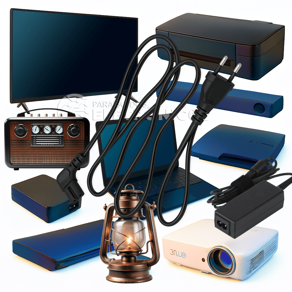 Lanternas, impressoras, notebooks, monitores, TVs, rádios e dispositivos das marcas Philips, Samsung, LG, entre muitas outras que utilizam conexão Tipo 8.