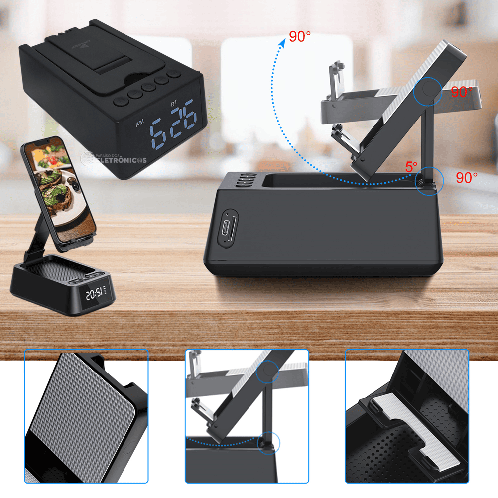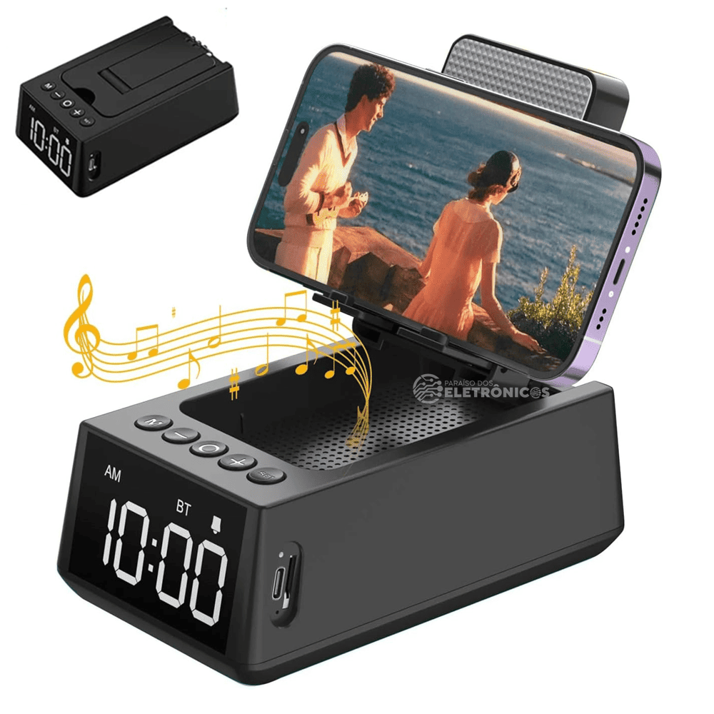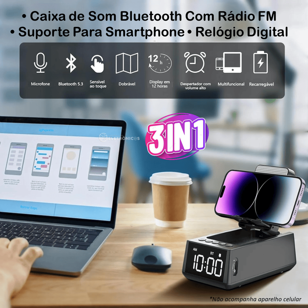 Função 3 em 1: Caixa de som com rádio FM, suporte para celular e relógio digital