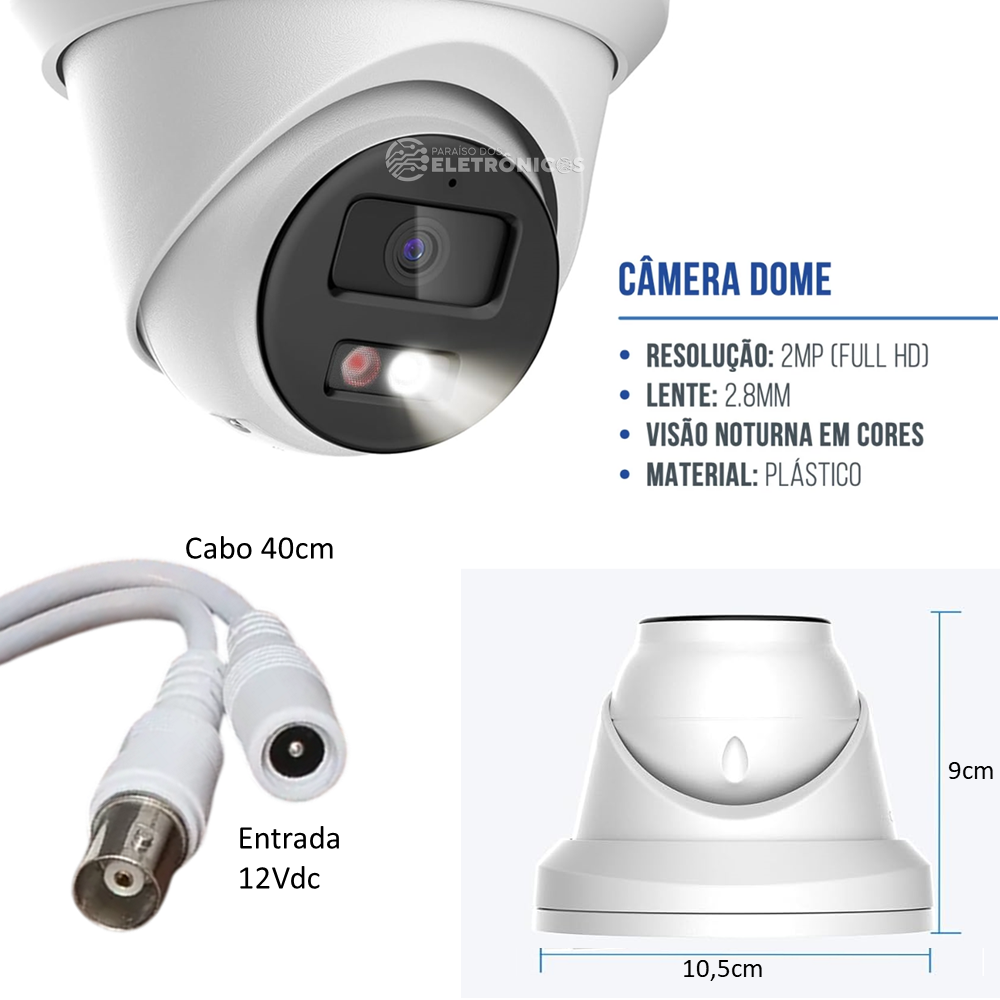 Câmera de Segurança Dome 4 em 1 Full HD 2MP Visão Noturna em Cores Com Cabo Coaxial de 10 Metros – KIT056