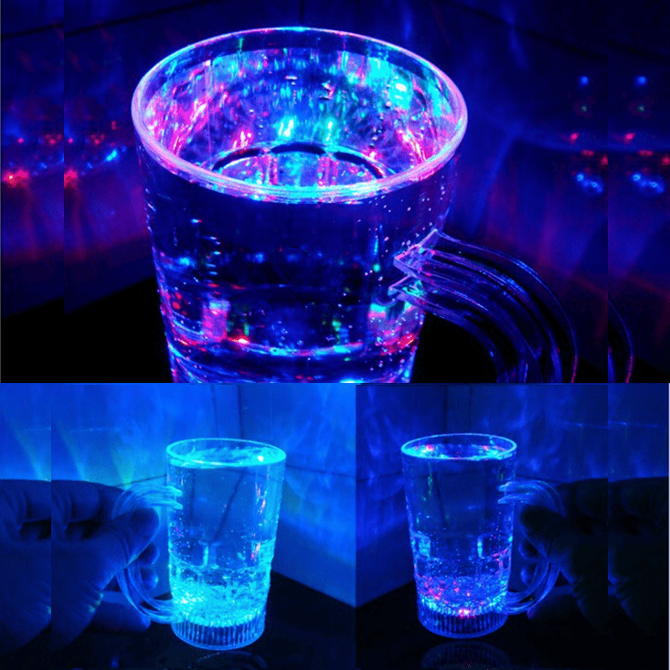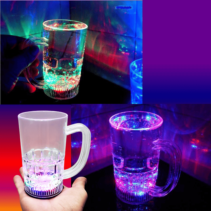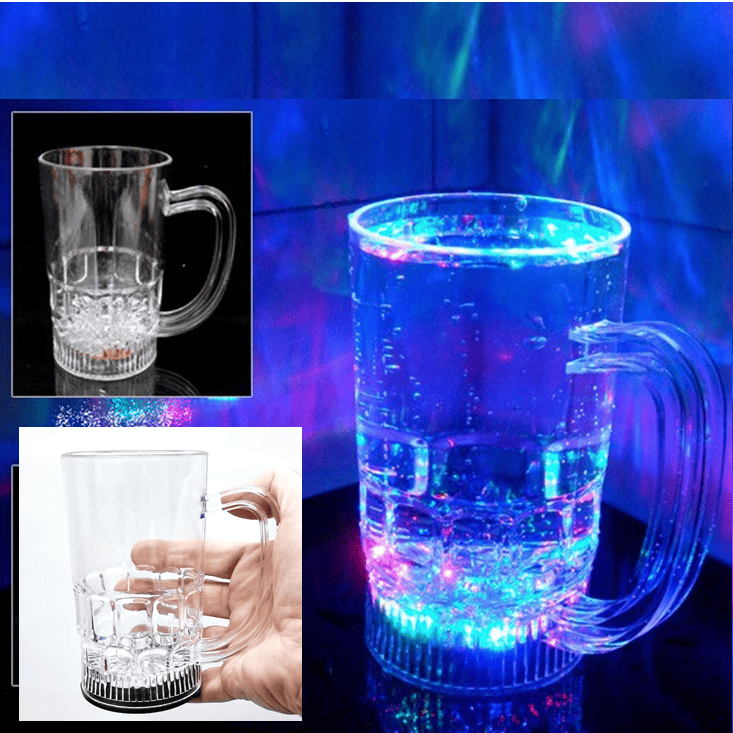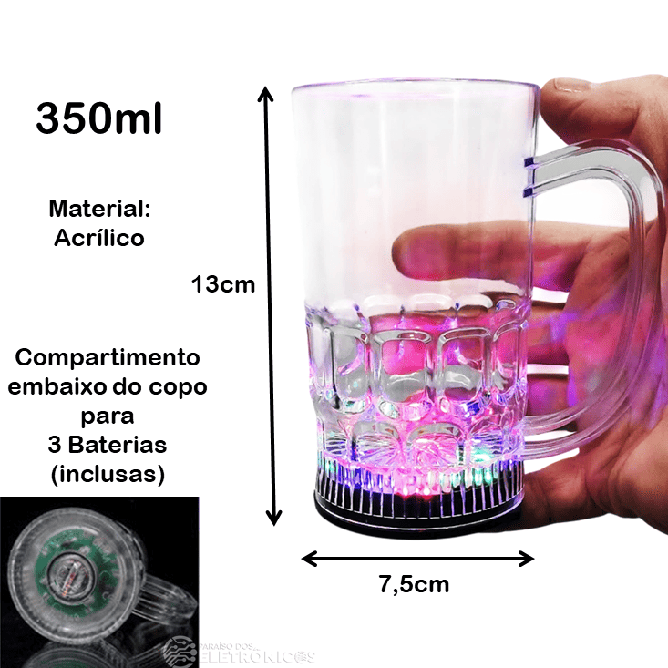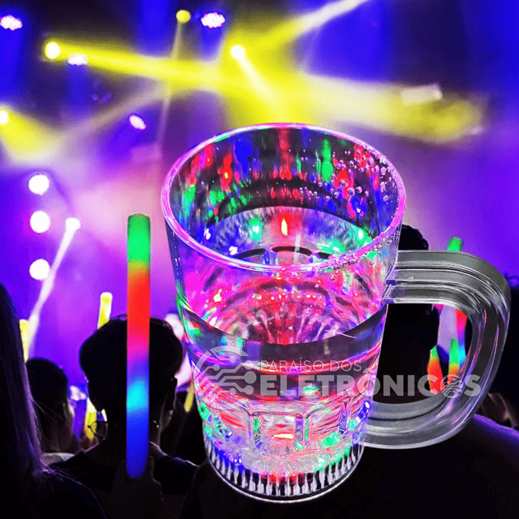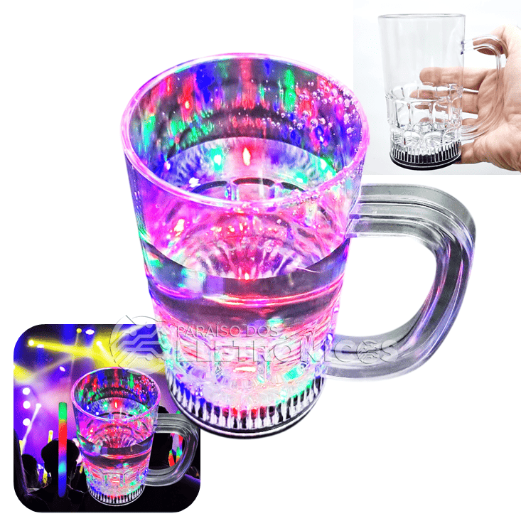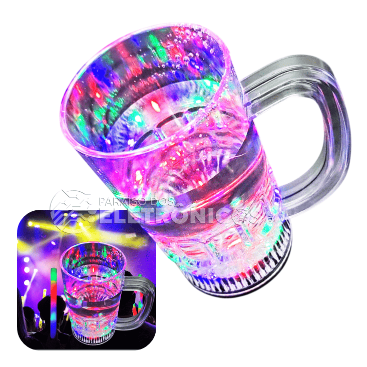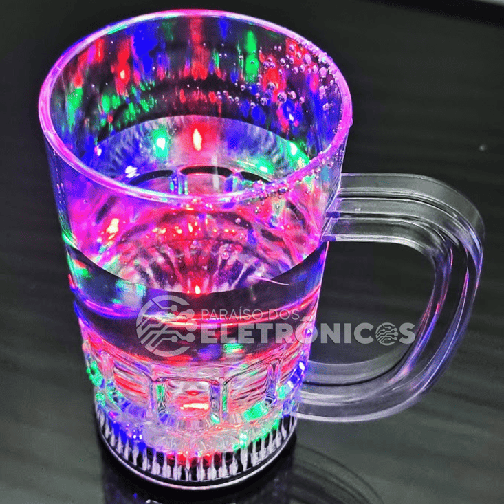 As luzes coloridas se encontram na base, o que dá um efeito luminoso. Feita em acrílico reflete a luz colorida por toda a caneca e por dentro do liquido dando um lindo efeito.