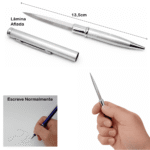 Fabricada com estrutura resistente e acabamento metálico, oferece durabilidade e conforto no uso. Seu formato ergonômico permite escrever normalmente com precisão, enquanto o sistema de tampa oculta a lâmina com segurança, mantendo o visual de uma caneta tradicional.