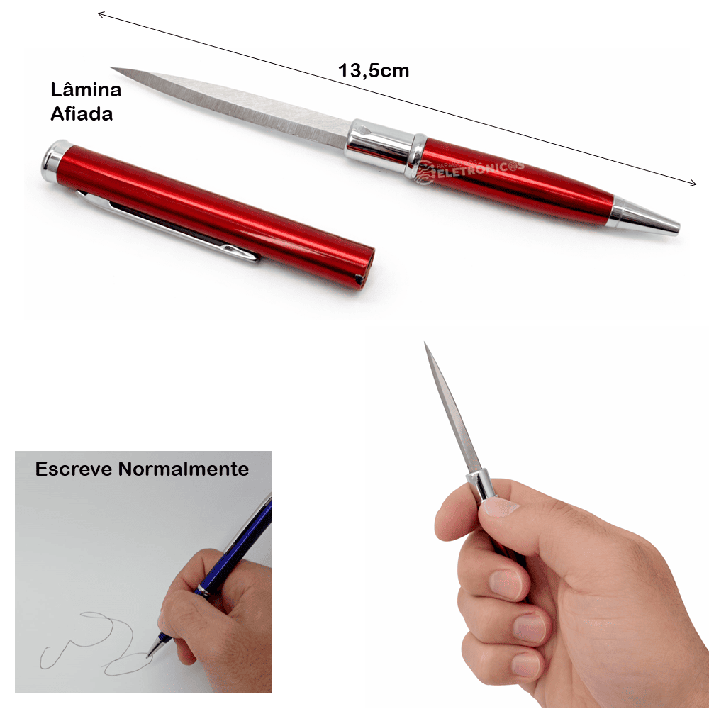 Fabricada com estrutura resistente e acabamento metálico, oferece durabilidade e conforto no uso. Seu formato ergonômico permite escrever normalmente com precisão, enquanto o sistema de tampa oculta a lâmina com segurança, mantendo o visual de uma caneta tradicional.