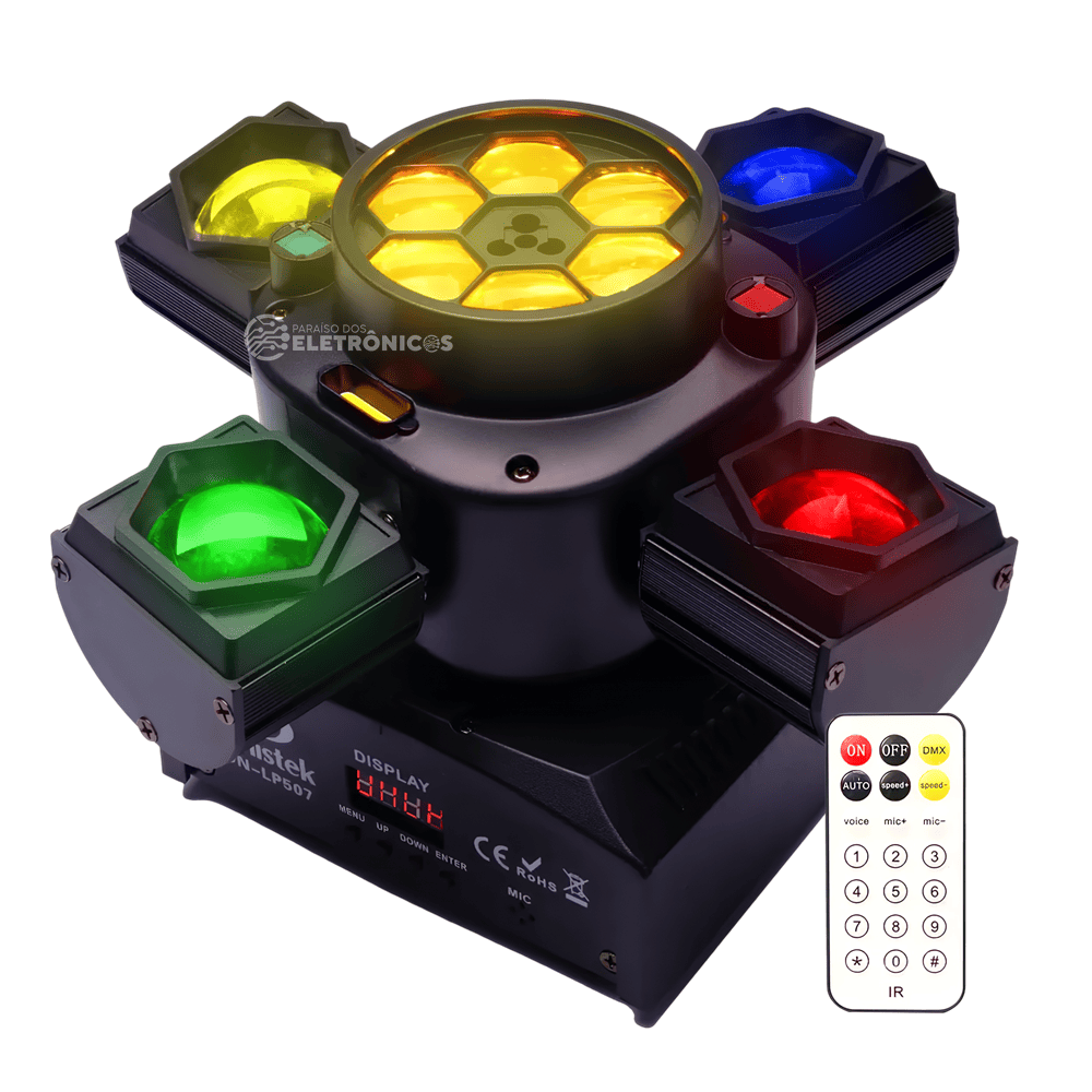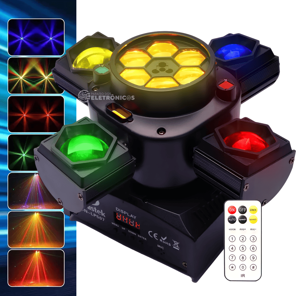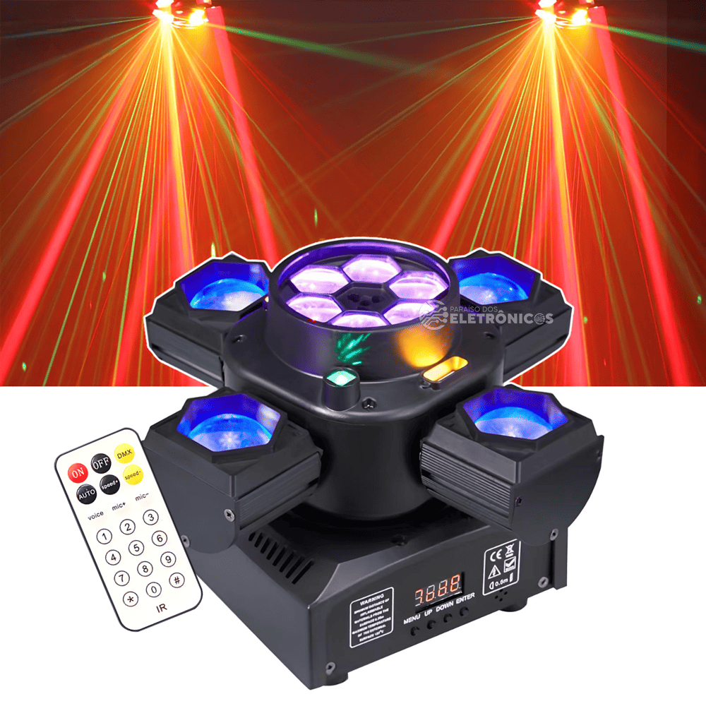 Acompanha controle remoto sem fio, permitindo operar todas as funções com praticidade — cores, modos de movimento, strobo, lasers e muito mais.