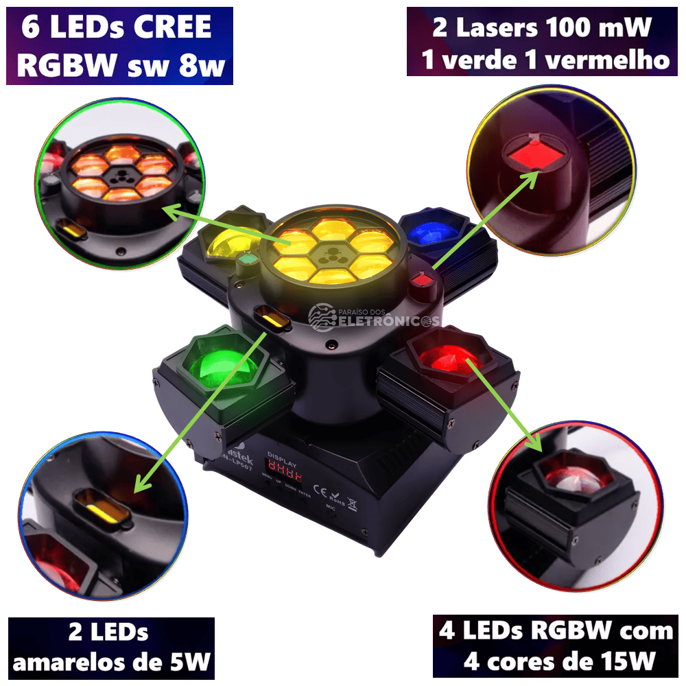Diferenciais do produto: Rotação completa de 360º 2 lasers que criam efeitos impressionantes LED RGBW 80W de alta potência Controle remoto sem fio Montagem flexível, com suporte para teto Leve, resistente e de alta durabilidade Compatível com mesas DMX, permitindo controle profissional Instalação simples e excelente custo-benefício