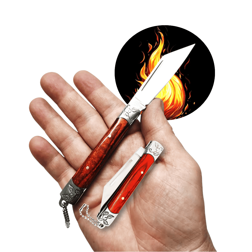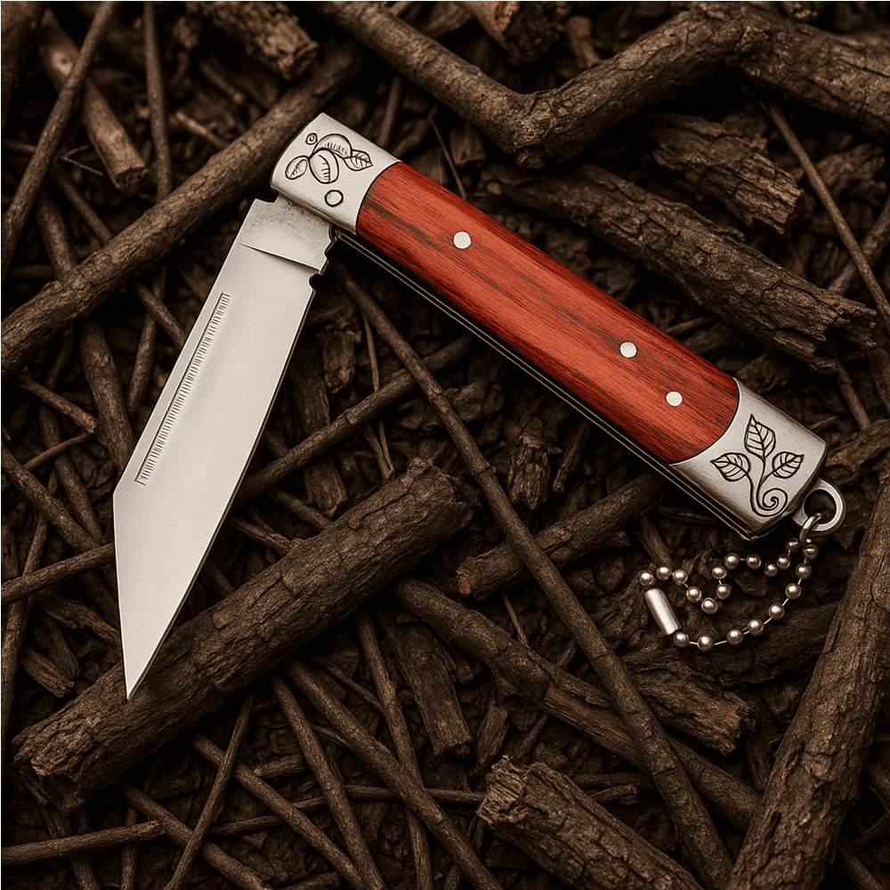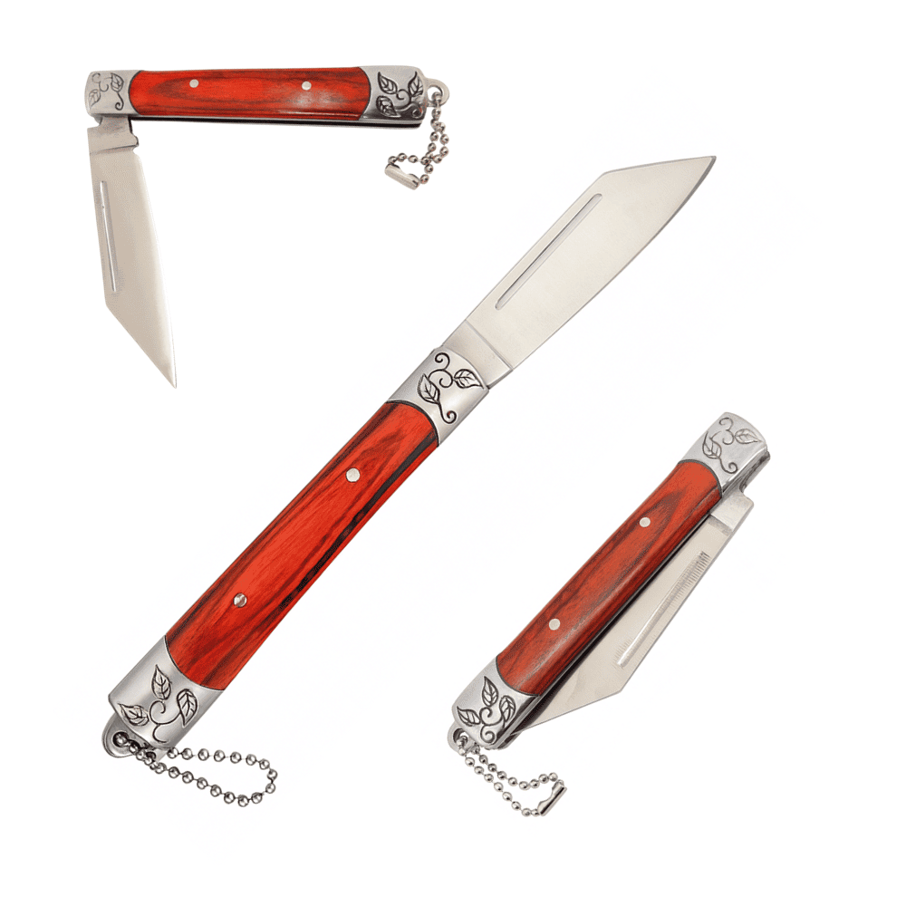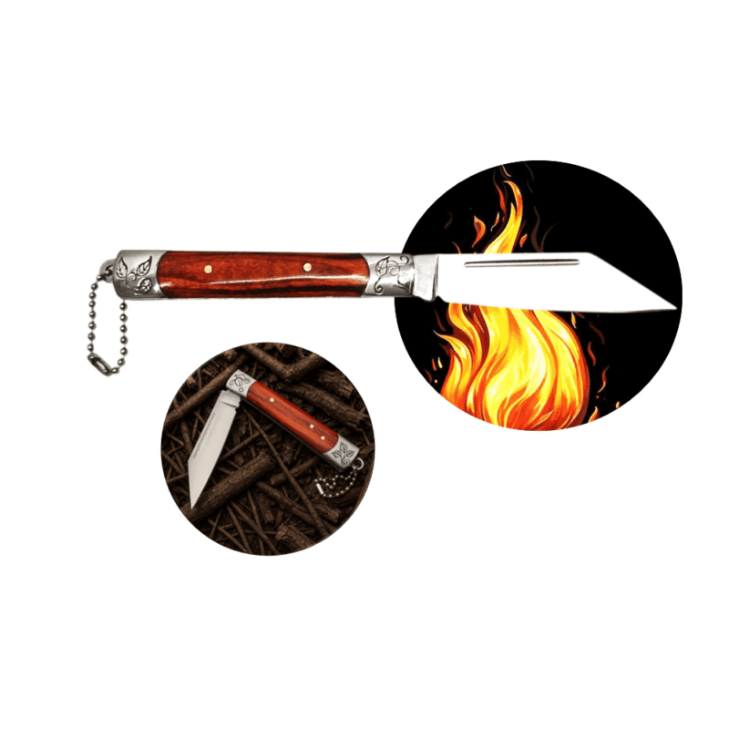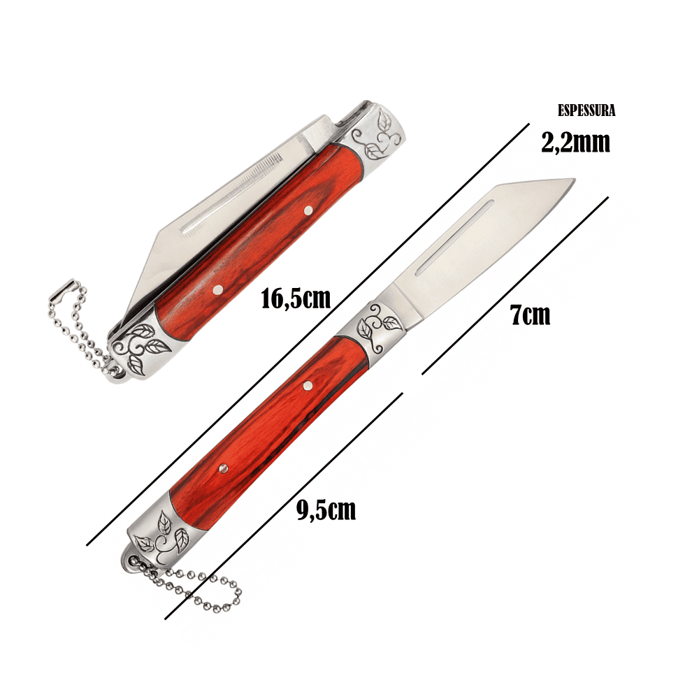 O cabo de 9,5cm, fabricado em aço com acabamento em madeira, proporciona firmeza e conforto na empunhadura, além de um visual elegante e rústico. A gravação metálica nos detalhes traz um toque especial de sofisticação, tornando este canivete não apenas uma ferramenta, mas também um item de coleção para apreciadores.