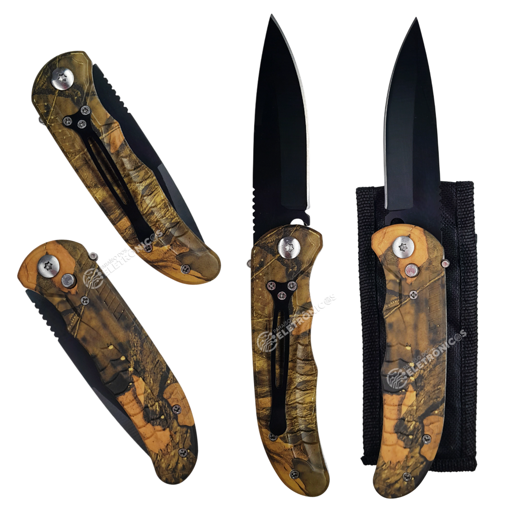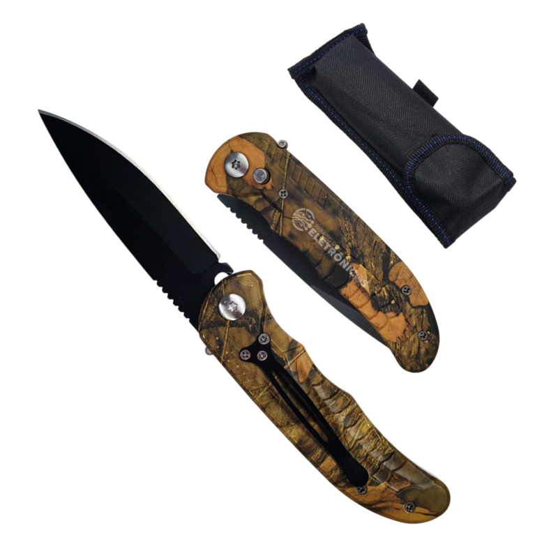 O Canivete Automático de Bolso com Bainha para Caça e Pesca Selva Camuflado é a ferramenta ideal para quem busca praticidade, resistência e segurança. Com lâmina de 10 cm em aço inoxidável e cabo fabricado em aço inoxidável e plástico, este canivete oferece durabilidade e excelente desempenho em diversas situações. Seu design compacto, com comprimento total de 21,5 cm e espessura da lâmina de 1,8 mm, o torna perfeito para atividades ao ar livre, como caça e pesca.