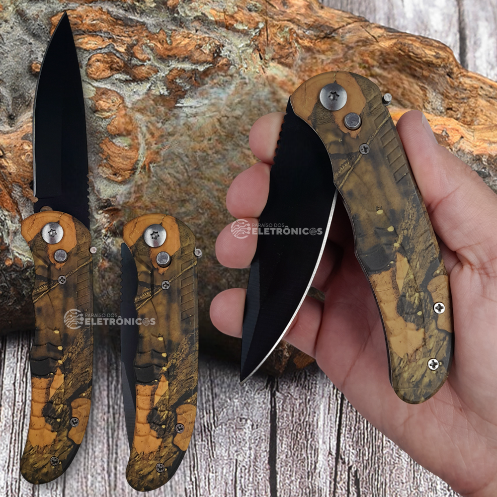 Além de ser eficiente, é altamente seguro e prático, possuindo abertura automática e trava de segurança para evitar acidentes. A presilha inclusa facilita o transporte no bolso ou na cintura, enquanto a bainha proporciona mais praticidade no armazenamento. Com um peso leve de apenas 130 gramas, este canivete camuflado é uma excelente escolha para quem precisa de uma ferramenta confiável e fácil de carregar durante suas aventuras na natureza.