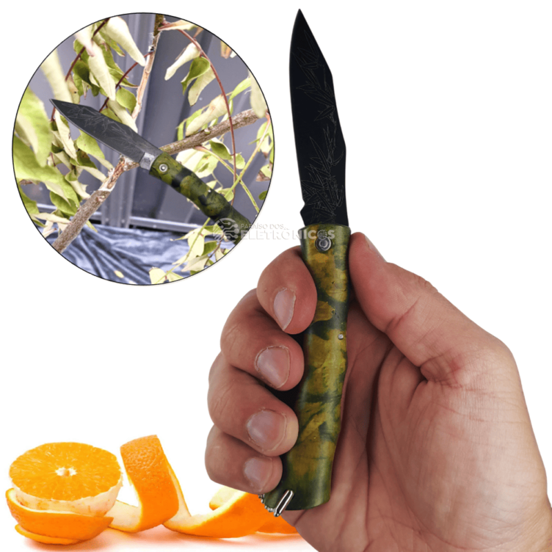 O cabo é feito de metal e plástico com acabamento camuflado, garantindo não apenas um visual discreto e estiloso, mas também uma pegada segura e confortável durante o uso. Com um peso de apenas 40 gramas, ele é leve o suficiente para ser carregado facilmente, mas robusto para resistir a exigências em ambientes externos. Este canivete é a escolha ideal para quem busca um aliado funcional, durável e prático para suas atividades de pesca e camping.