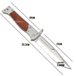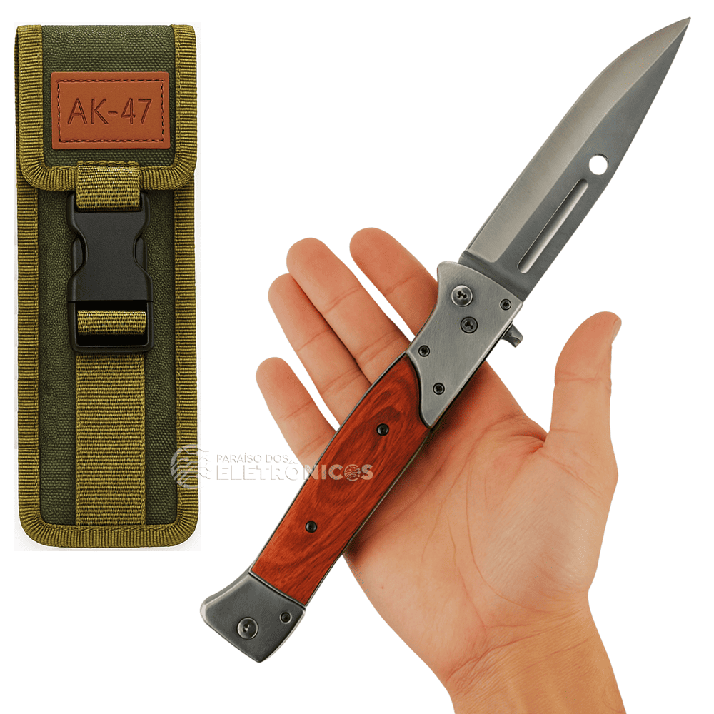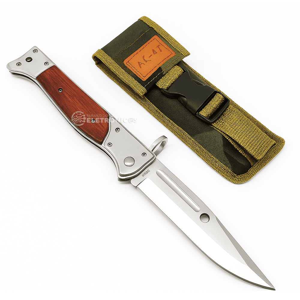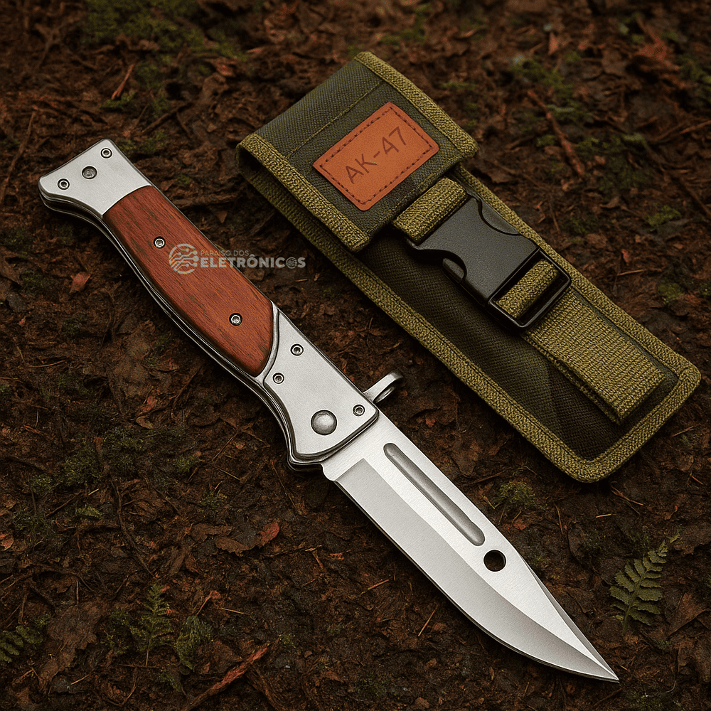 O cabo, confeccionado em resina e aço inoxidável, oferece firmeza e conforto na pegada, mesmo em atividades prolongadas. Com 33,5cm de comprimento total, sendo 15cm de lâmina e 13cm de cabo, o canivete tem um peso equilibrado de 400g, proporcionando estabilidade sem perder a praticidade. Acompanha uma capinha resistente estilo militar para transporte seguro, com encaixe perfeito para o dia a dia ou aventuras ao ar livre.