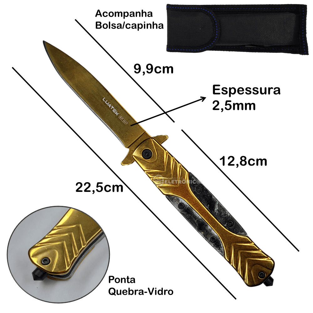 Domine qualquer situação com o robusto SLK-D331, projetado para quem exige o máximo em desempenho tático. Este canivete semiautomático impressiona pela sua lâmina generosa de 9,9cm em aço inoxidável, combinada com um quebra-vidros de emergência integrado. Com construção full metal (cabo em aço inoxidável), oferece durabilidade excepcional para uso profissional, seja para segurança pessoal, atividades outdoor ou situações críticas no dia a dia.