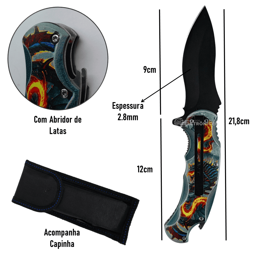 A lâmina de 9cm em aço inoxidável com 2.8mm de espessura garante cortes precisos e durabilidade. O clip de cinto reforçado permite transporte seguro, e a trava evita acidentes durante o uso. Com 21.8cm de comprimento total, oferece ótimo balanço na mão e inclui capinha protetora para conservação prolongada – essencial para quem busca praticidade sem abrir mão da qualidade.
