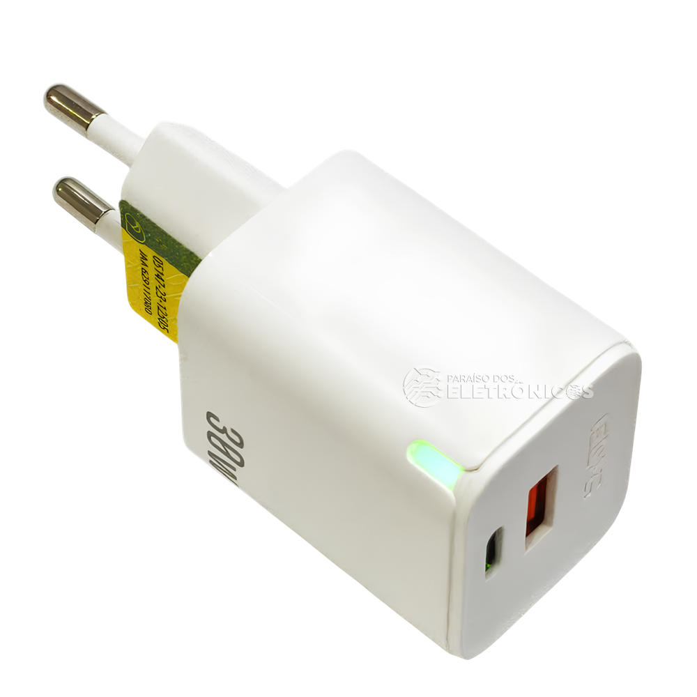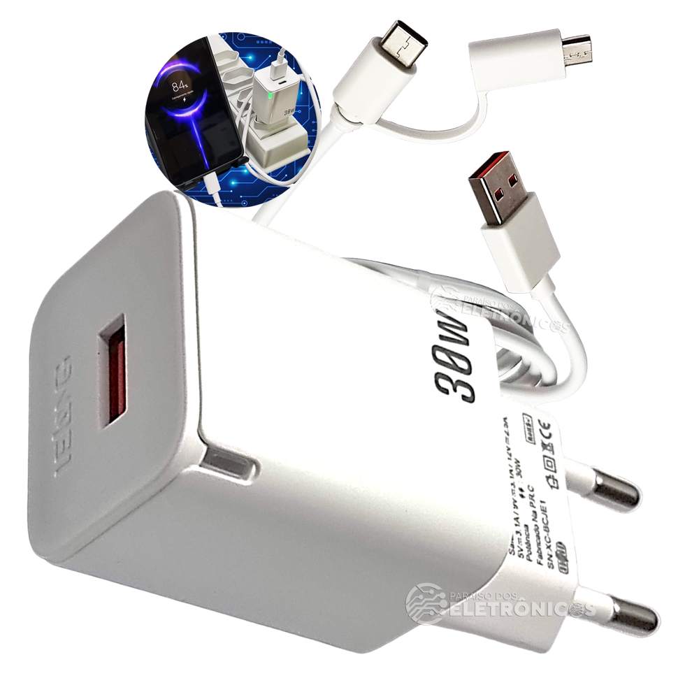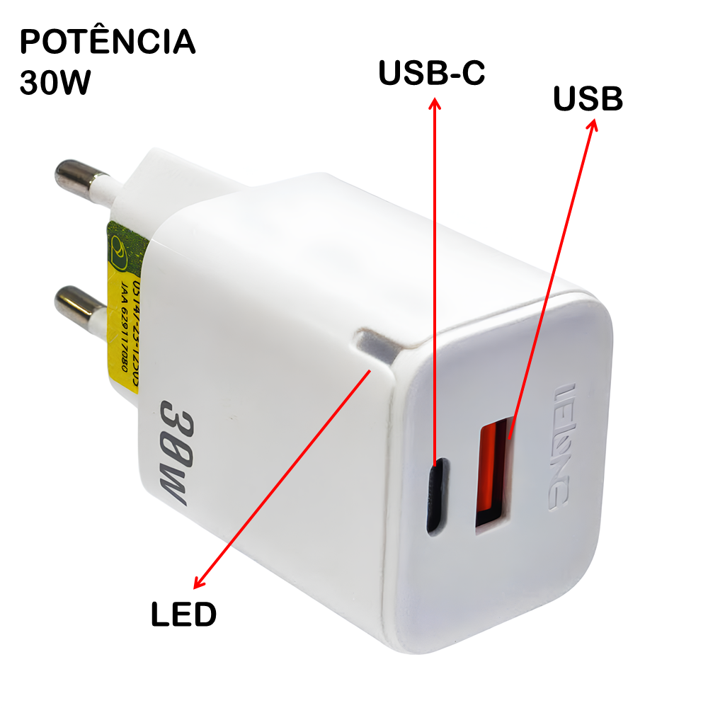 Carregador Rápido Dupla Saída USB e USB-C 30W 5v 3.1A Para Smartphone Com Cabo USB-C e Micro-USB – Branco LE295