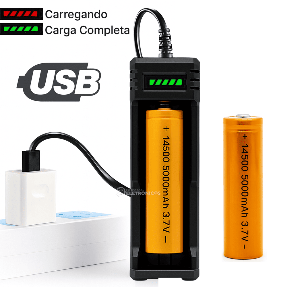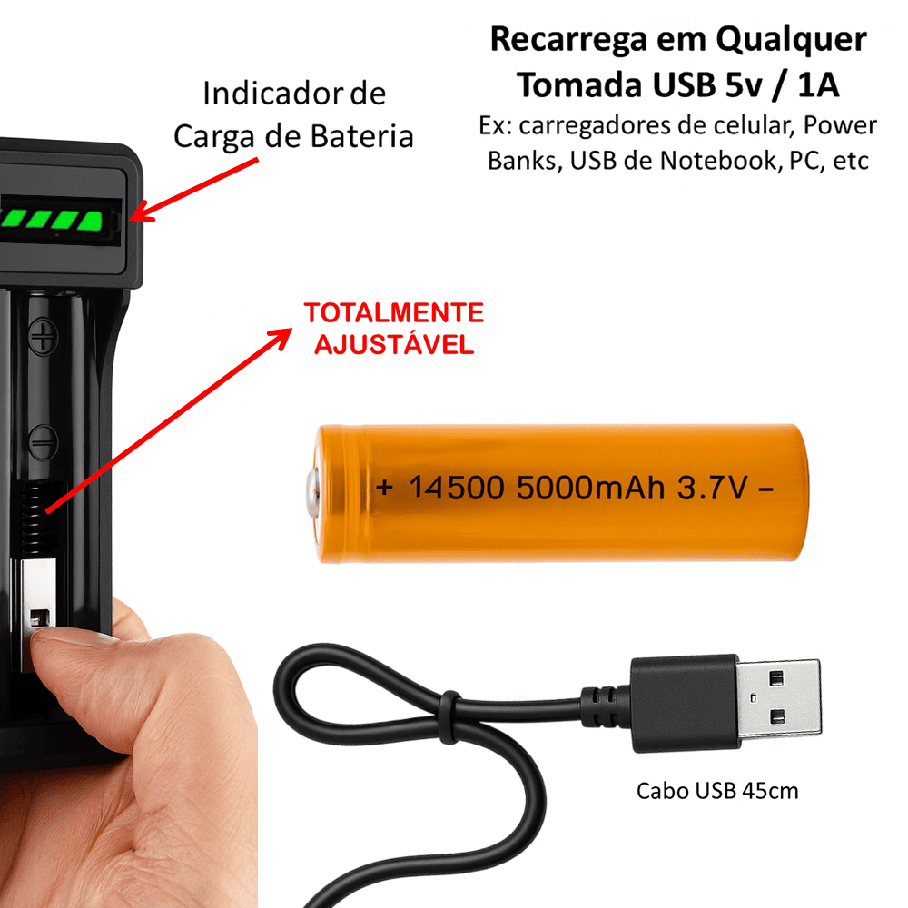 Carregador Universal com 2 bateriaS 14500 3.7V 5000mAh recarregáveis, se ajusta a outros tipos de bateria de 3cm ate 6,7cm. Possui Led indicador de Carga individual, sendo a cor vermelha indicando carregando e a cor verde carga completa, possui sistema de desligamento da corrente quando a carga estiver completa.