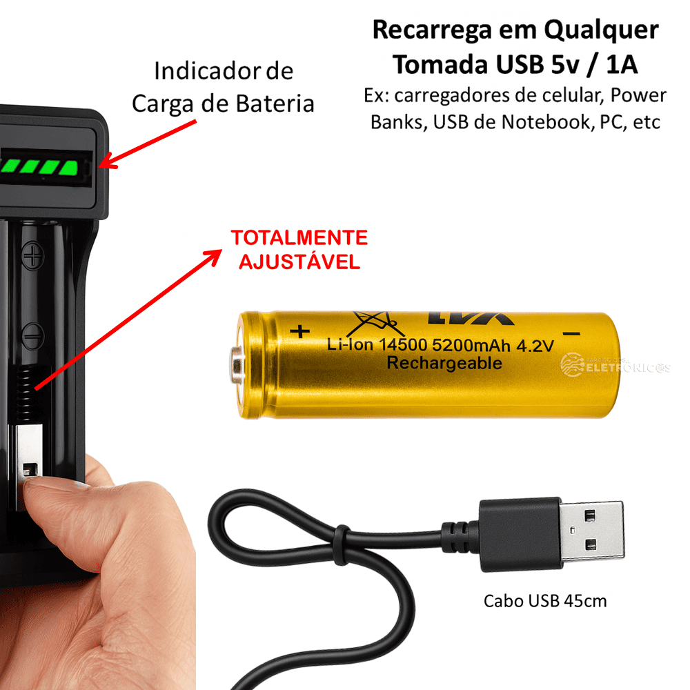 Carregador Universal USB Com 1 Bateria Recarregável 14500 4.2V 5200mAh Com Indicador de Carga