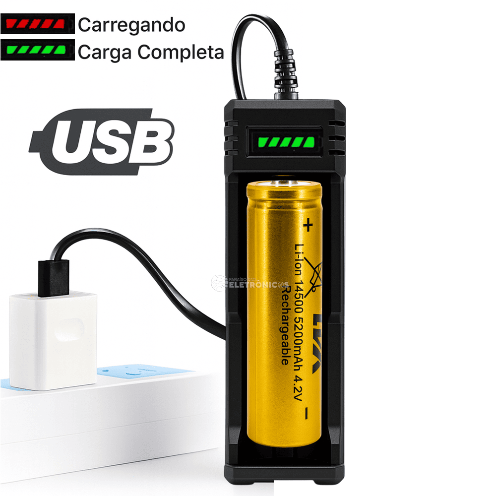 Carregador Universal USB Com 1 Bateria RecarregáveL 14500 4.2V 5200mAh, se ajusta a outros tipos de bateria de 3cm ate 6,7cm. Possui Led indicador de Carga individual, sendo a cor vermelha indicando carregando e a cor verde carga completa, possui sistema de desligamento da corrente quando a carga estiver completa.
