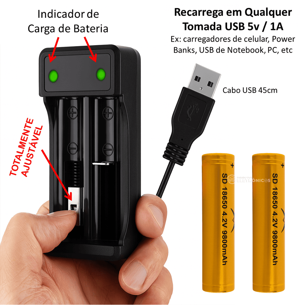Carregador Universal USB Com 2 Baterias Recarregáveis 18650 4.2V 9800mAh Com Indicador de Carga – LEY2034