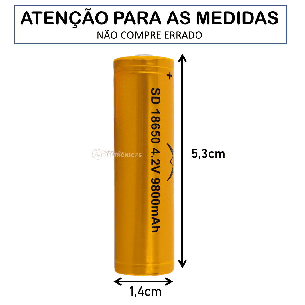 26650 / 18650 / 16340 / 14500 / 18500 / 16650 / 18350 / 10400 (com 3cm até 6,7cm de comprimento)