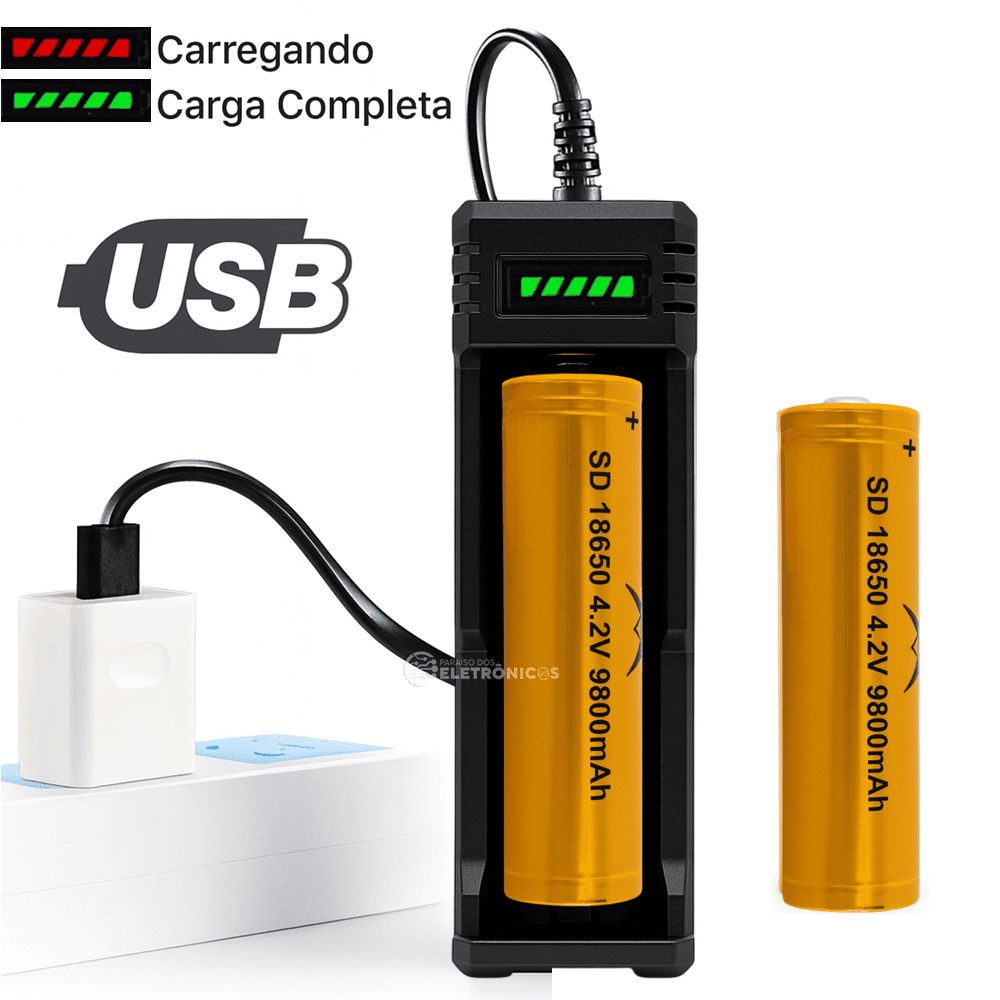 Carregador Universal USB Com 2 Bateria Recarregáveis 18650 4.2V 9800mAh, se ajusta a outros tipos de bateria de 3cm ate 6,7cm. Possui Led indicador de Carga individual, sendo a cor vermelha indicando carregando e a cor verde carga completa, possui sistema de desligamento da corrente quando a carga estiver completa.