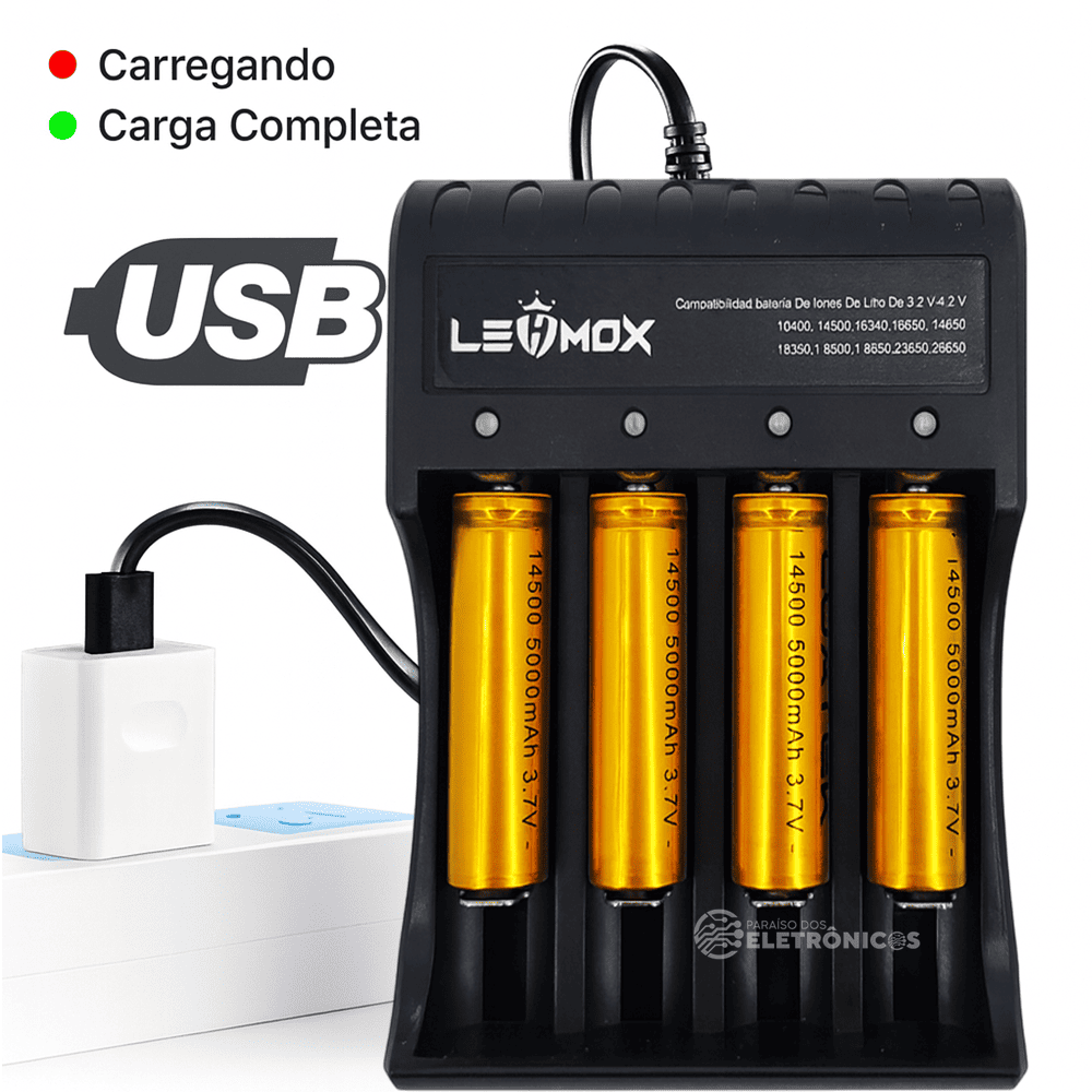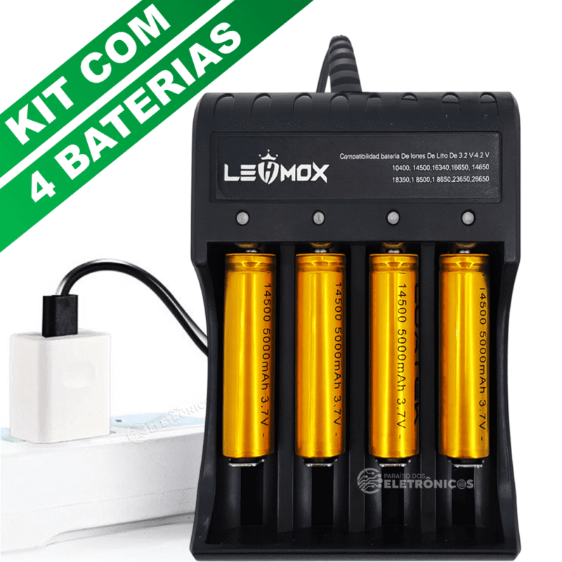 Carregador Universal com 4 baterias 14500 3.7V 5000mAh recarregáveis, se ajusta a outros tipos de bateria de 3cm ate 6,7cm, pode carregar até 4 ao mesmo tempo. Possui Led indicador de Carga individual, sendo a cor vermelha indicando carregando e a cor verde carga completa, possui sistema de desligamento da corrente quando a carga estiver completa.