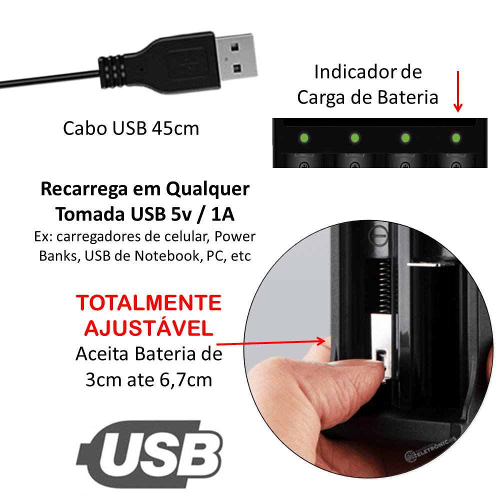 Carregador Portátil, que pode ser guardado em qualquer lugar. É alimentado por qualquer porta USB de 5v com pelo menos 1A, por exemplo carregadores de celular, Power Banks, saídas USB de Notebooks e PCs ou Tomadas USB.