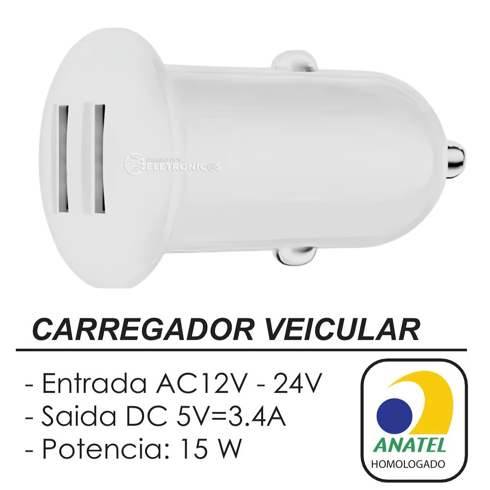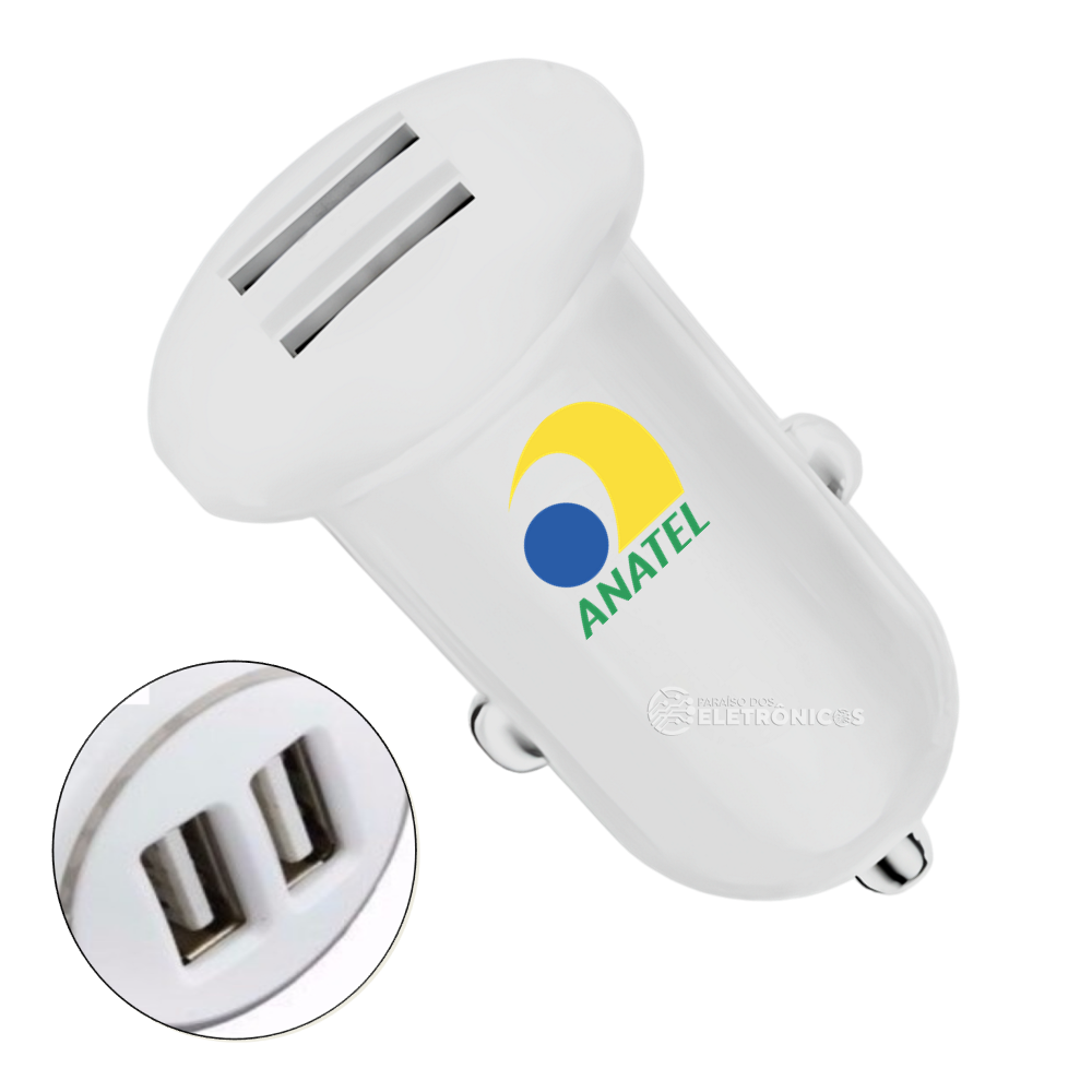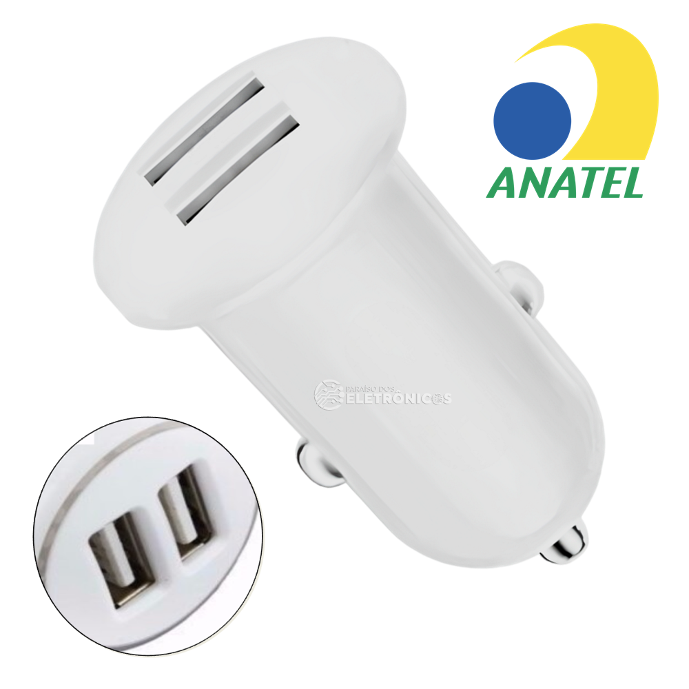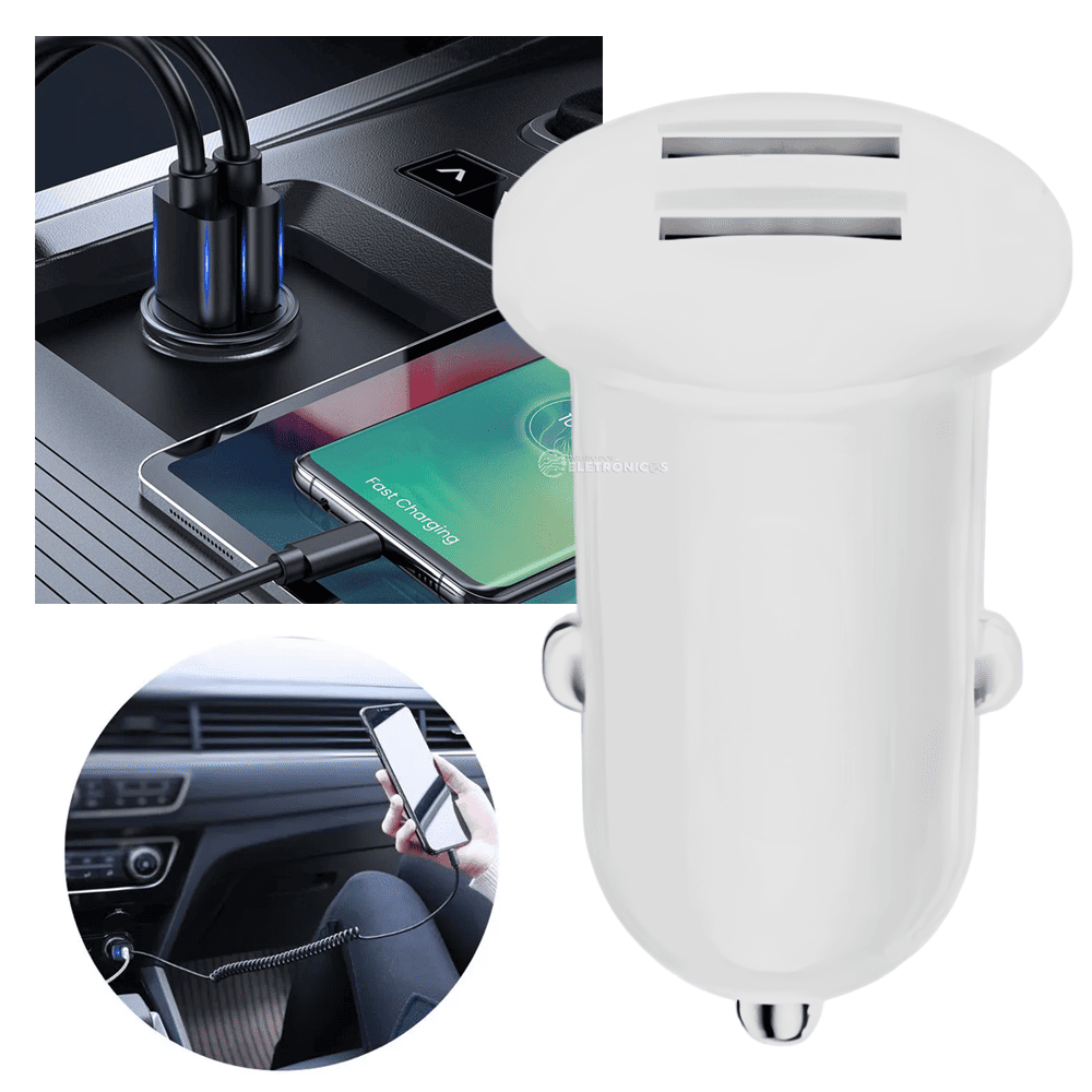 O carregador inteligente de alta velocidade tem 2 portas USB e é ideal para carregar aparelhos durante suas viagens. Ele é eficiente, rápido e seguro pois é homologado Anatel, além de ter uma entrada USB dupla que permite o uso com aparelhos celulares, smartphones, mp4, mp3, gps e tablets. Simples, rápido e eficiente Você pode ligar dois cabos no carregador ao mesmo tempo (não acompanha os cabos). Pode ser utilizados em carros ou motos de 12v ou caminhões e ônibus de 24v. O