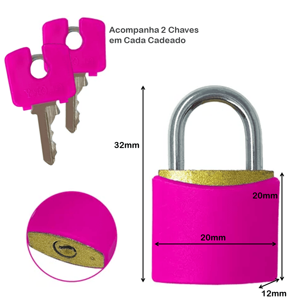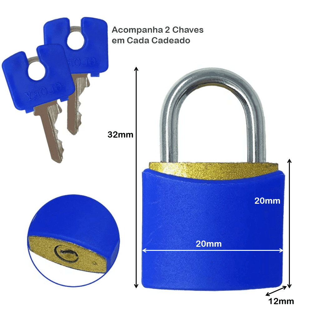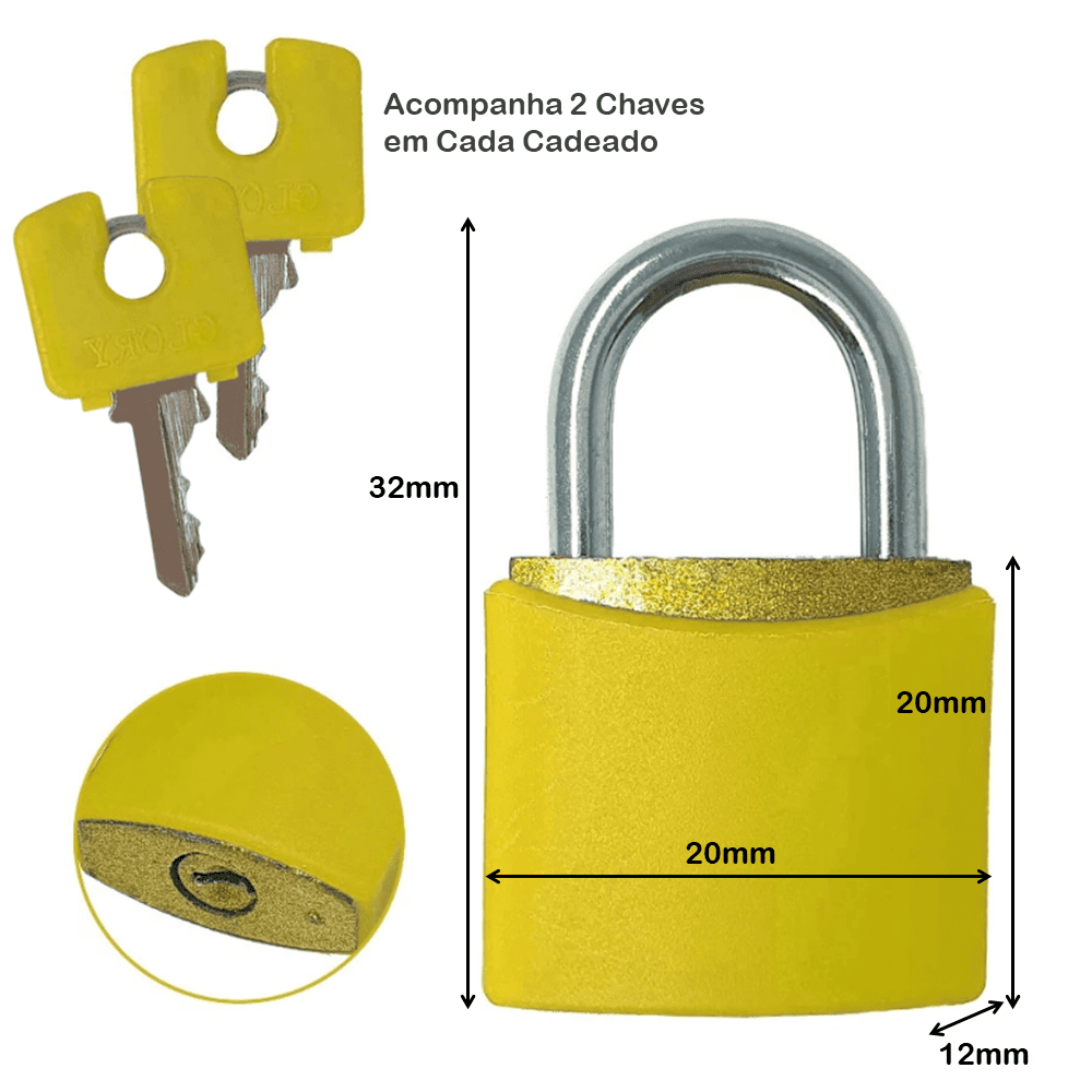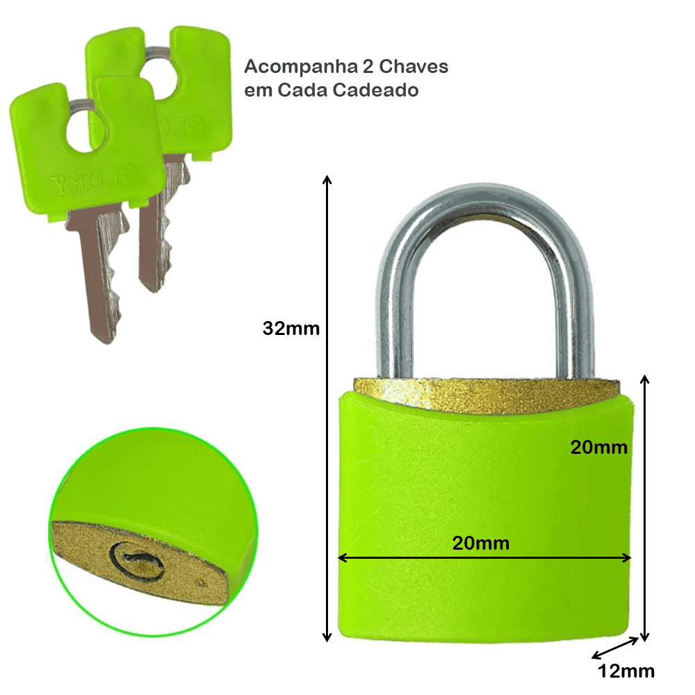 Os cadeados possuem o corpo em latão maciço e haste em aço inoxidável, sendo revestido por uma capa plástica colorida, ideal para marcações diversas.