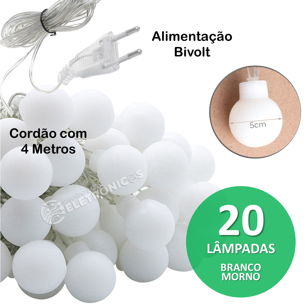 Luzes LED em formato de pequenas lâmpadas, produz um lindo efeito. Composto de 20 luzes em um fio de 4 metros de comprimento que ficam ligadas na cor branco-morno (não piscam). É ideal para decorar e iluminar festas noturnas, aniversários, temáticas, baladas, casamentos, formaturas, festas de natal e eventos.