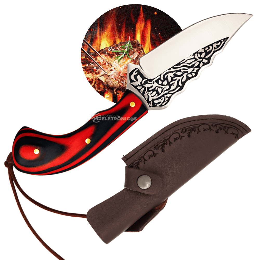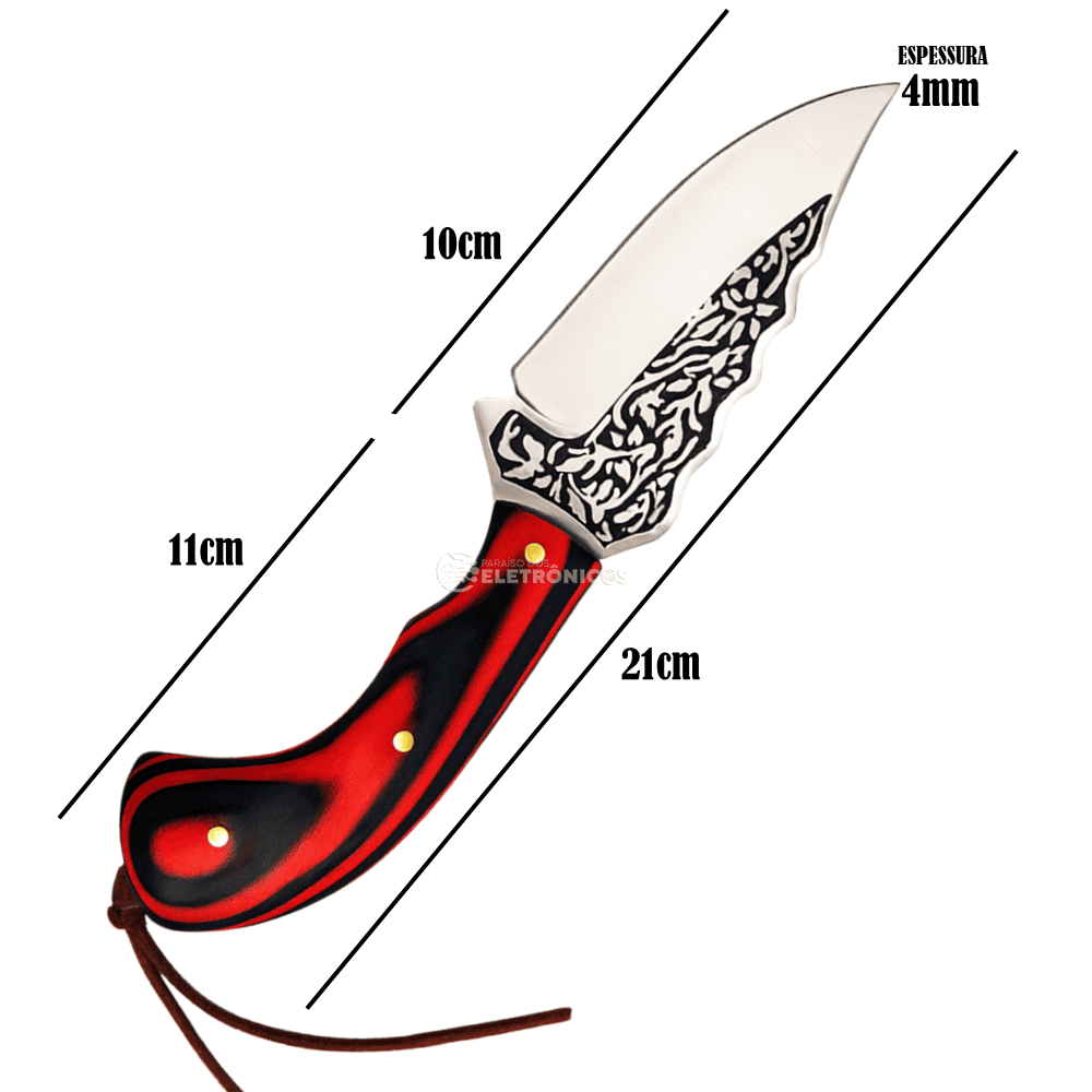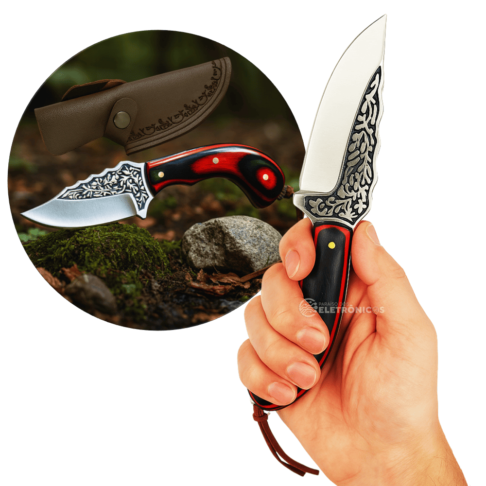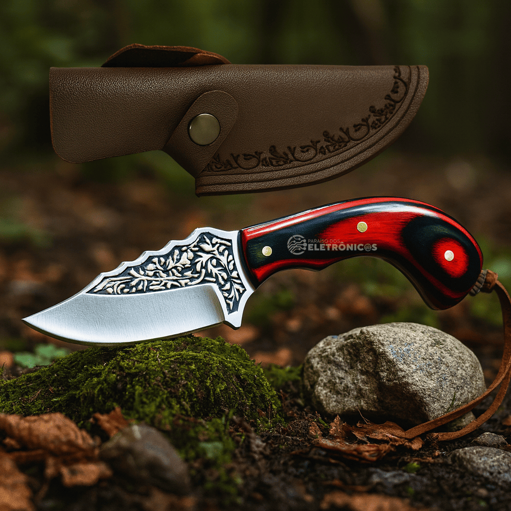 A Faca Artesanal de Aço Inox com Detalhes Ornamentais é uma peça diferenciada que une robustez, beleza e funcionalidade. Sua lâmina curva em aço inoxidável recebe gravações elegantes, garantindo não apenas resistência e durabilidade, mas também um visual único e sofisticado. O cabo ergonômico, disponível em cores vibrantes como verde, vermelho ou preto, oferece firmeza e conforto no manuseio, sendo perfeito para colecionadores, aventureiros e amantes de cutelaria.