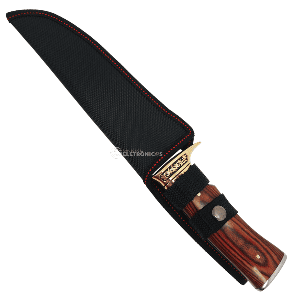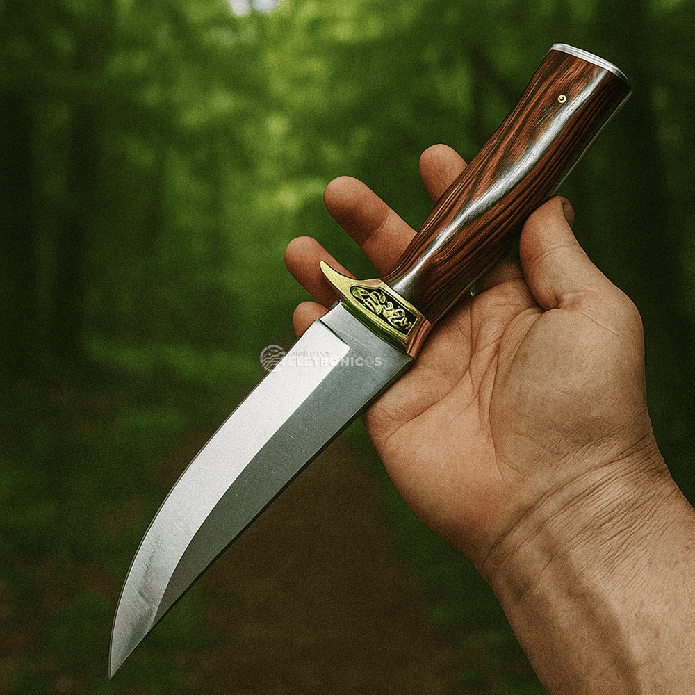 O cabo é confeccionado em aço e madeira natural, oferecendo um equilíbrio impecável entre conforto e firmeza. O design ergonômico permite uma pegada segura, mesmo em tarefas mais exigentes. Além disso, os detalhes em metal trabalhado nas extremidades do cabo conferem um toque de sofisticação e robustez, tornando esta faca não apenas uma ferramenta funcional, mas também uma peça de destaque.