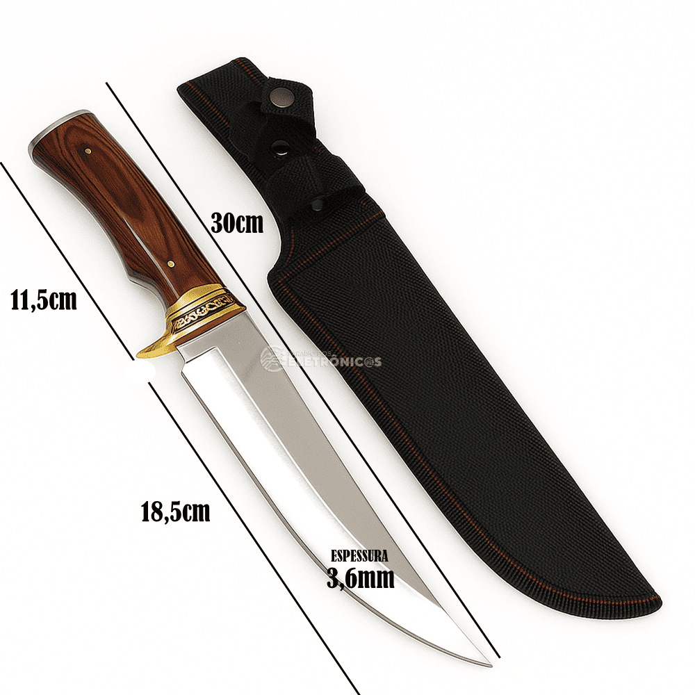 Com 30 cm de comprimento total, sendo 18,5 cm de lâmina e 3,8 mm de espessura, a Faca G57 é uma verdadeira parceira para quem busca qualidade. O modelo Full Tang (lâmina integral) assegura resistência e durabilidade superiores. Acompanha uma capinha de proteção com costura reforçada, ideal para transporte seguro e armazenamento. Com 380 gramas de peso, é leve, equilibrada e pronta para qualquer desafio.
