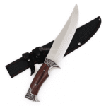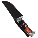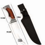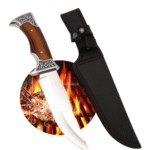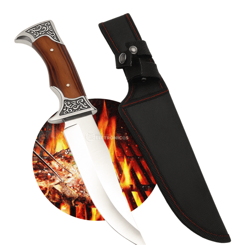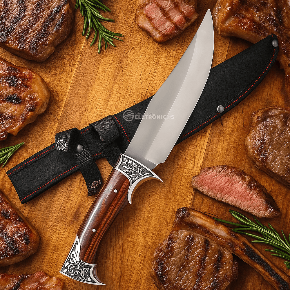 O cabo é confeccionado em aço e madeira natural, oferecendo um equilíbrio impecável entre conforto e firmeza. O design ergonômico permite uma pegada segura, mesmo em tarefas mais exigentes. Além disso, os detalhes em metal trabalhado nas extremidades do cabo conferem um toque de sofisticação e robustez, tornando esta faca não apenas uma ferramenta funcional, mas também uma peça de destaque.