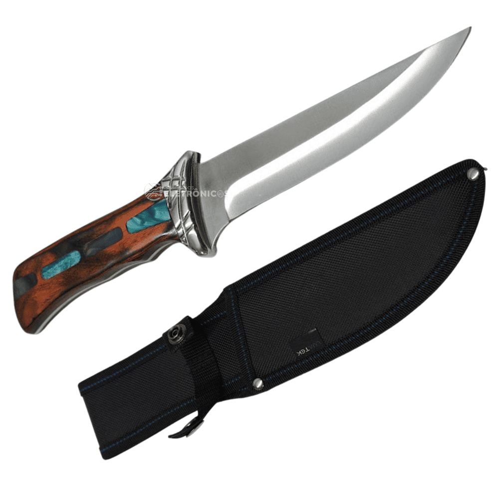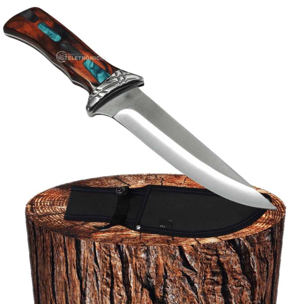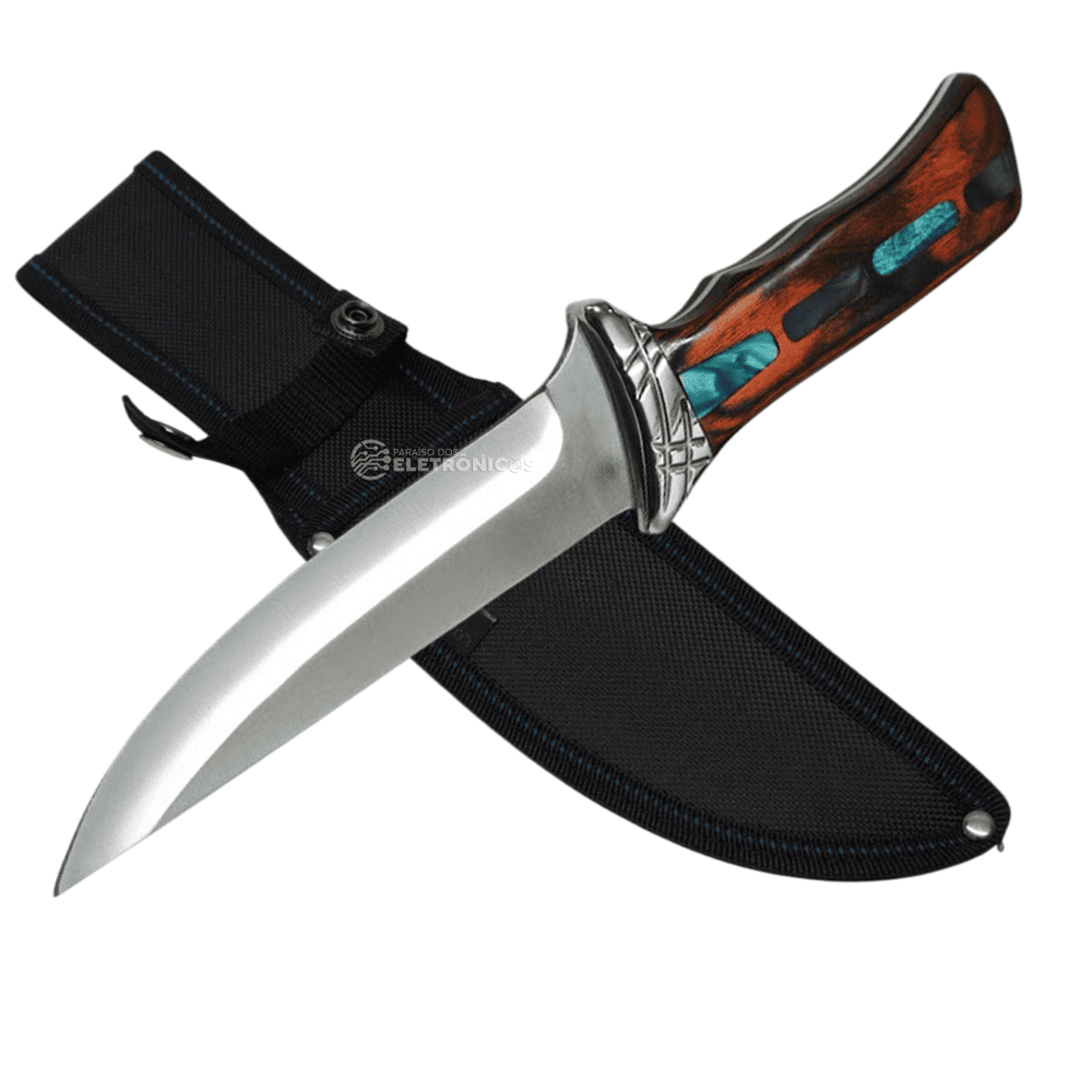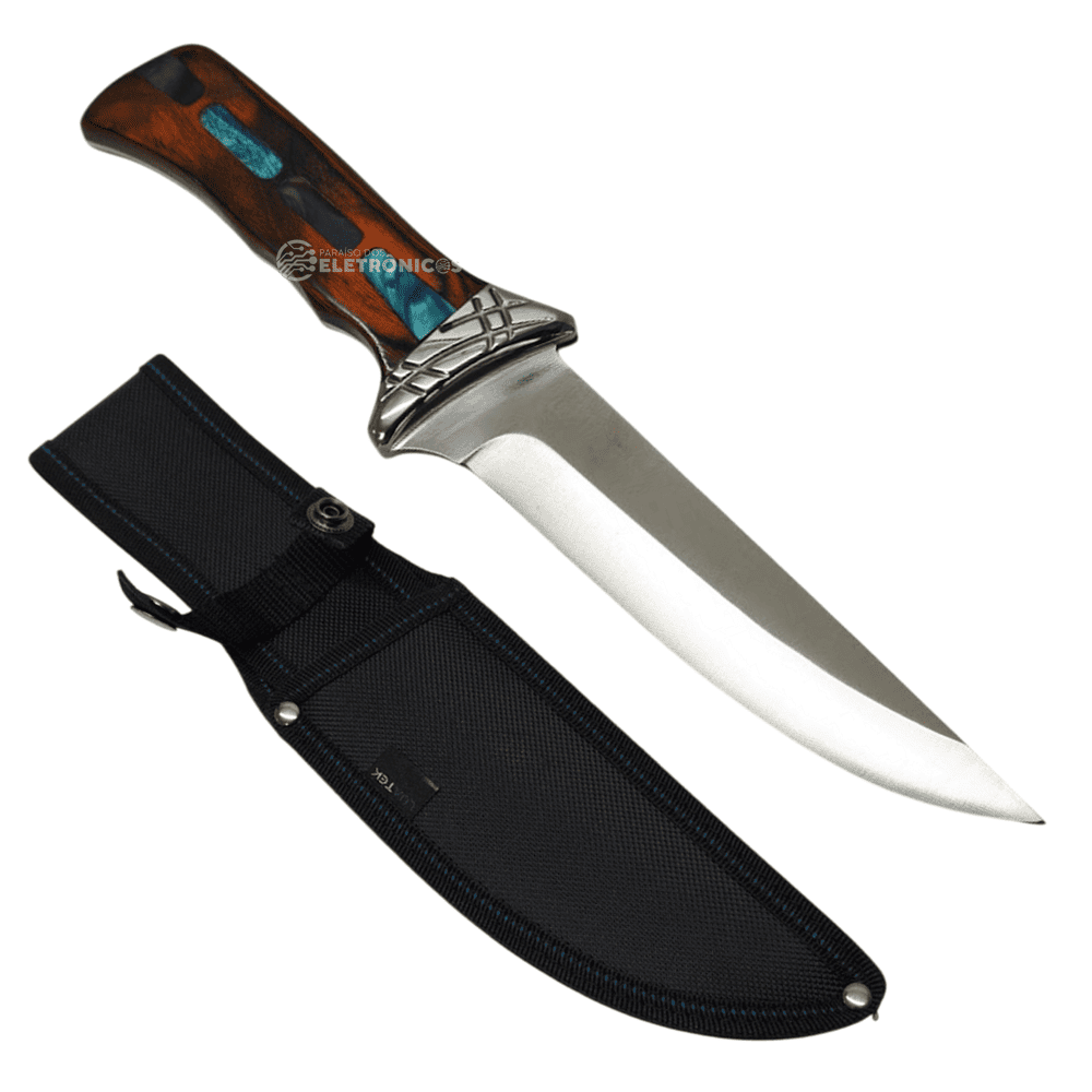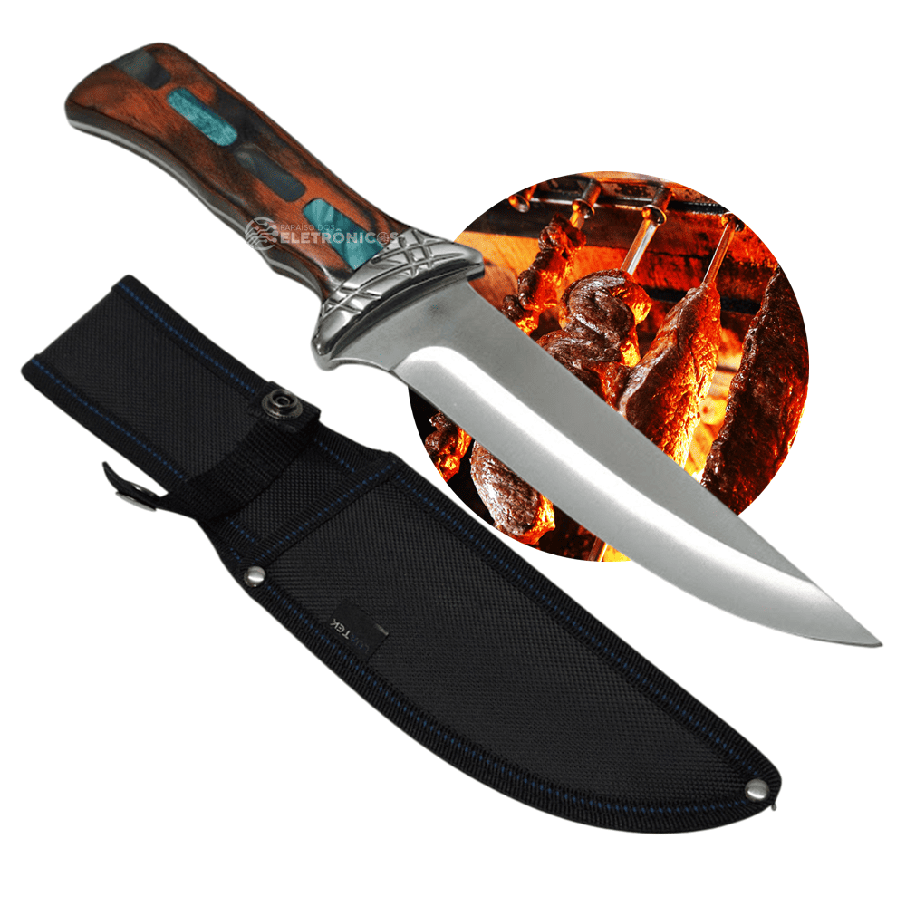 Acompanha bainha resistente em nylon com costura reforçada e botão de pressão, garantindo proteção e facilidade no transporte. Seu design funcional e acabamento refinado tornam essa faca uma excelente escolha tanto para churrasqueiros exigentes quanto para amantes de cutelaria. É uma peça que une durabilidade, beleza e praticidade em um único produto.