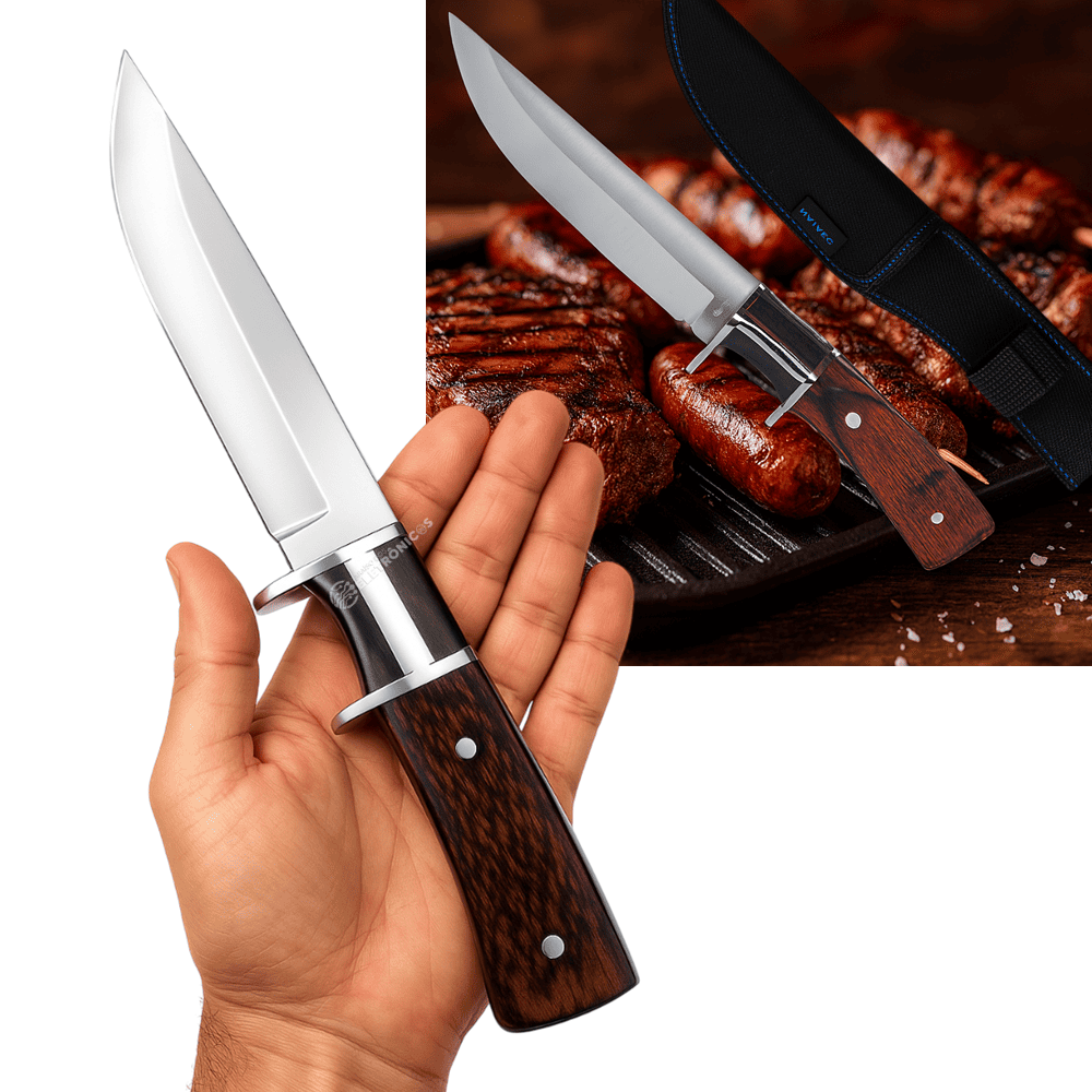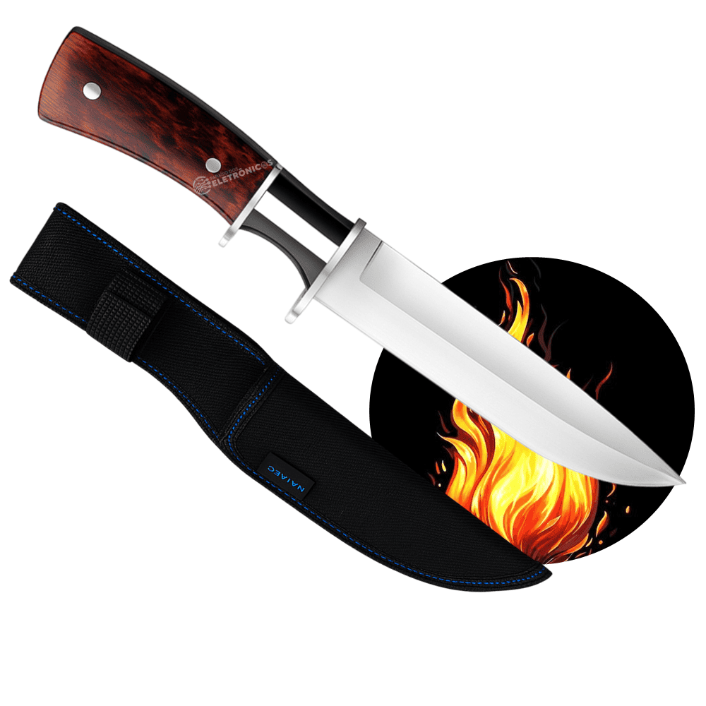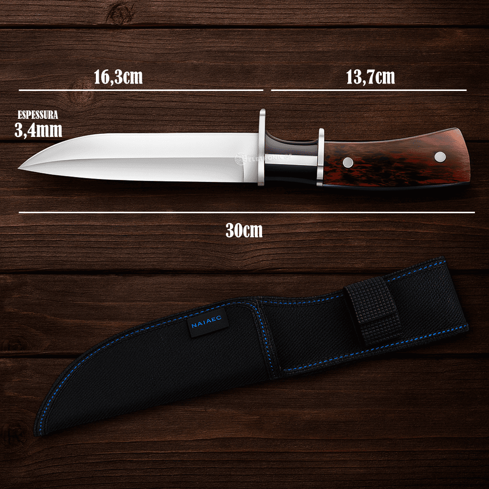 Com 30 cm de comprimento total, sendo 16,3 cm de lâmina e 13,7 cm de cabo, essa faca entrega equilíbrio perfeito entre alcance e controle. O sistema Full Tang aumenta a resistência, tornando-a ainda mais confiável em situações de uso intenso. Além disso, o guarda-mão oferece mais segurança durante o manuseio, evitando acidentes e garantindo firmeza mesmo em cortes mais pesados.