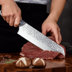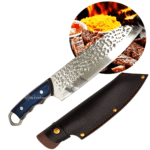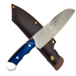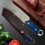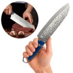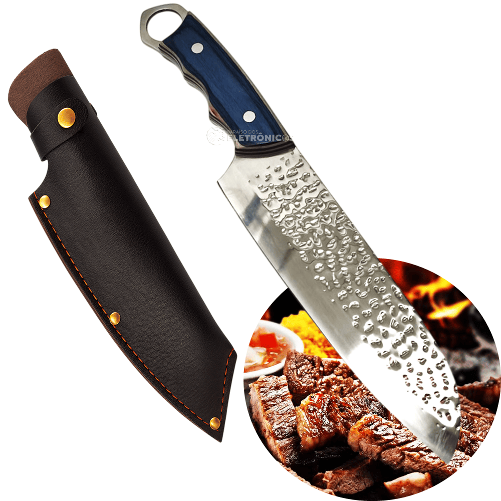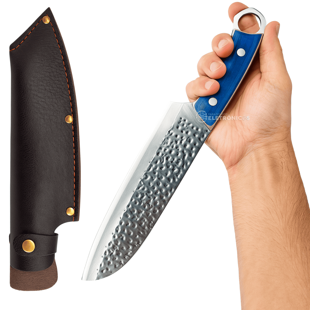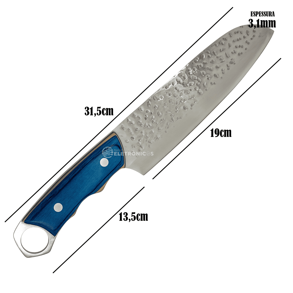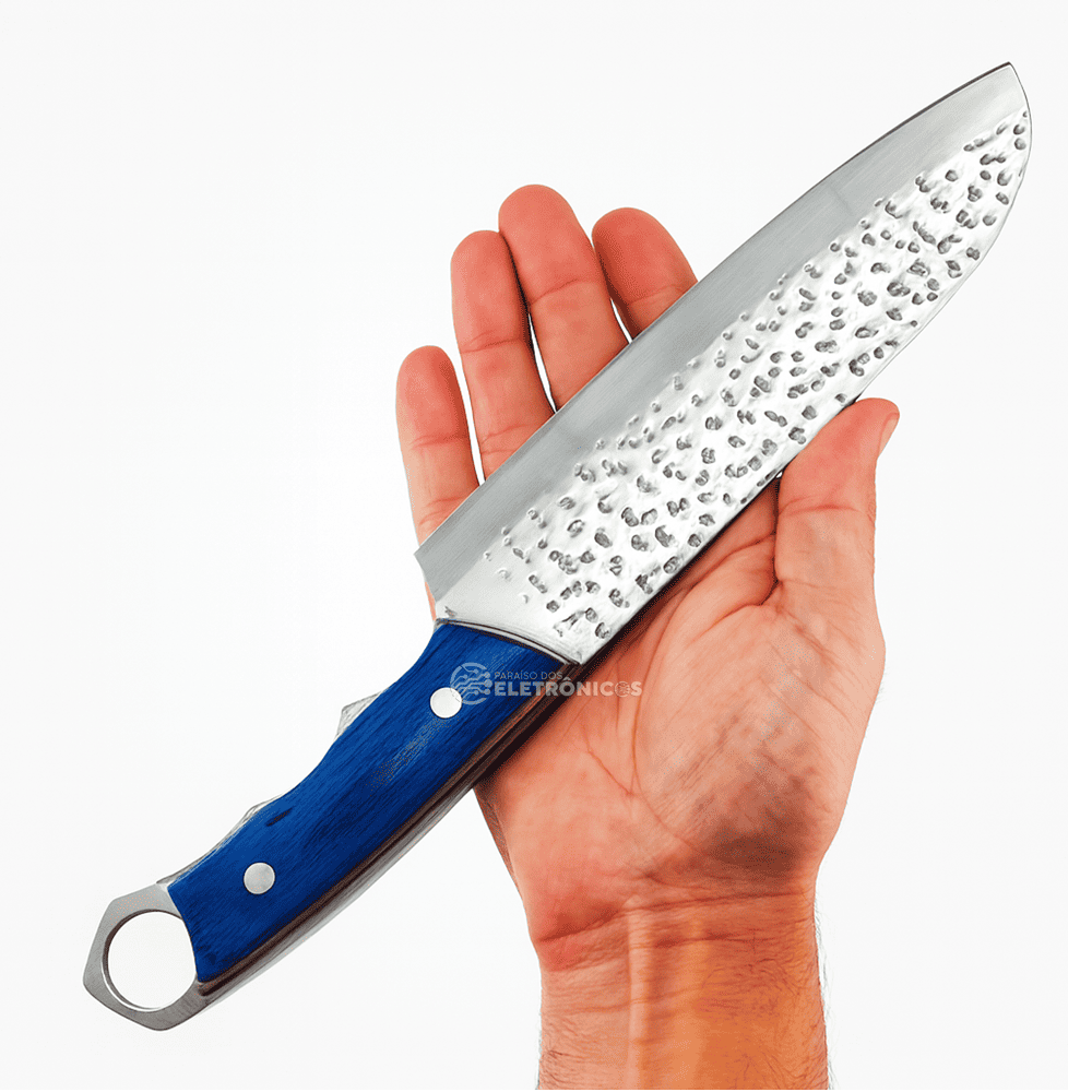 O cabo, produzido em aço e madeira com acabamento azul elegante, mede 13,5 cm e oferece firmeza e conforto ao manusear. O sistema full tang aumenta a resistência e o equilíbrio da faca, tornando-a ideal para cortes robustos e repetitivos sem perder a precisão. É uma escolha perfeita tanto para chefs profissionais quanto para entusiastas da gastronomia que buscam utensílios de alto desempenho.