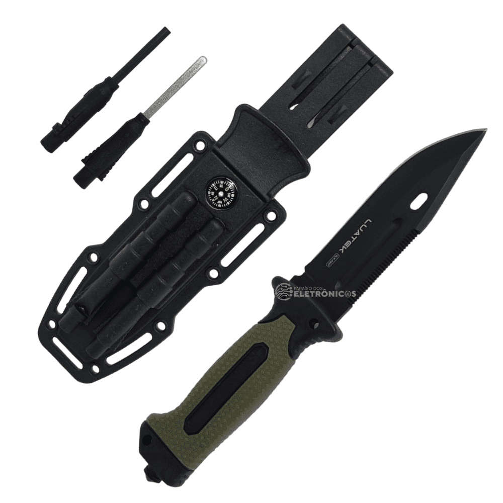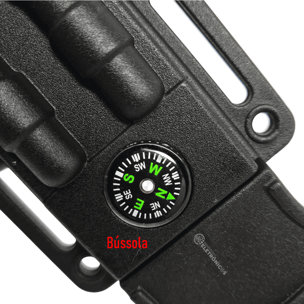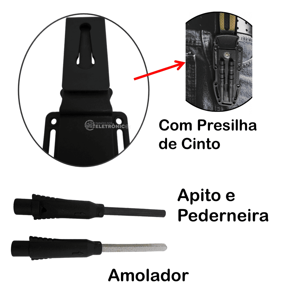 Além disso, nossa exclusiva bainha em polímero oferece praticidade no transporte e armazenamento, enquanto a inclusão de uma pederneira, um apito e um amolador tornam este produto uma ferramenta versátil e indispensável em situações de emergência.