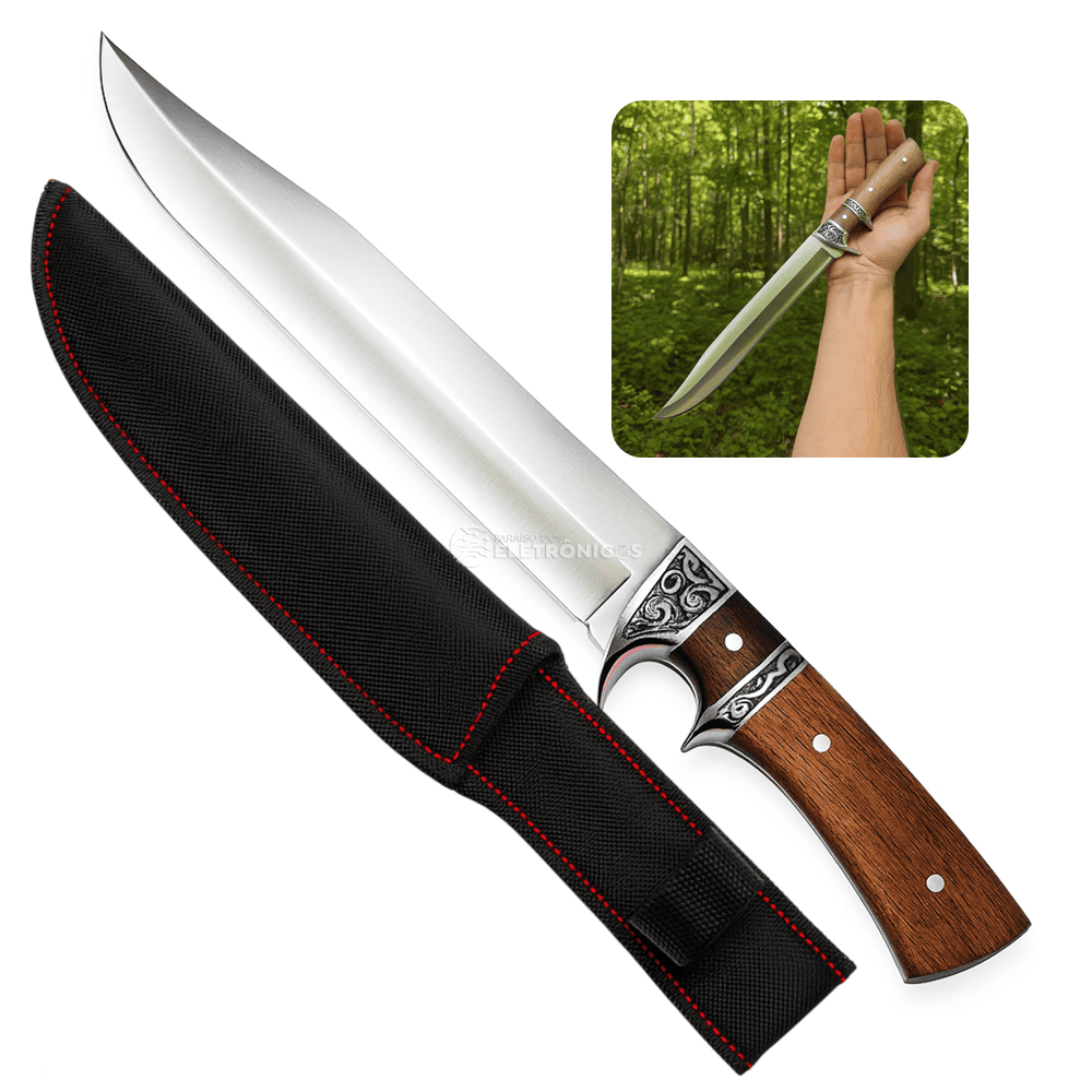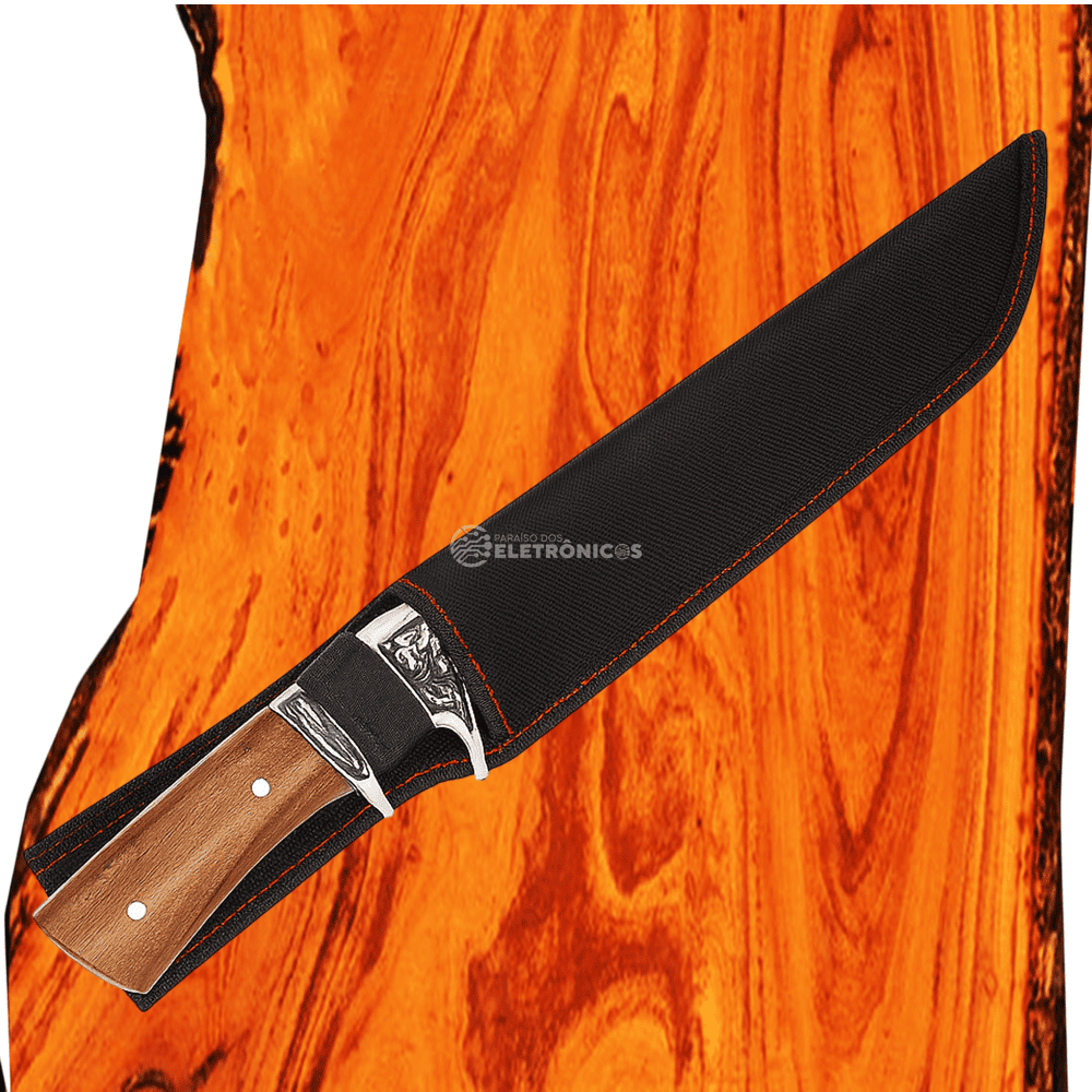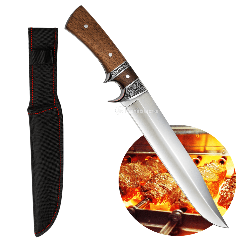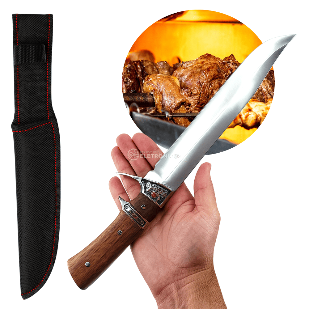 Com 38 cm de comprimento total e pesando 330 gramas, a faca alia solidez e praticidade, sem abrir mão da leveza necessária para uso prolongado. Acompanha ainda uma capa protetora em nylon reforçado, que facilita o transporte e protege a lâmina. Uma peça indispensável para quem busca qualidade, desempenho e design premium em seus utensílios de churrasco e cozinha.
