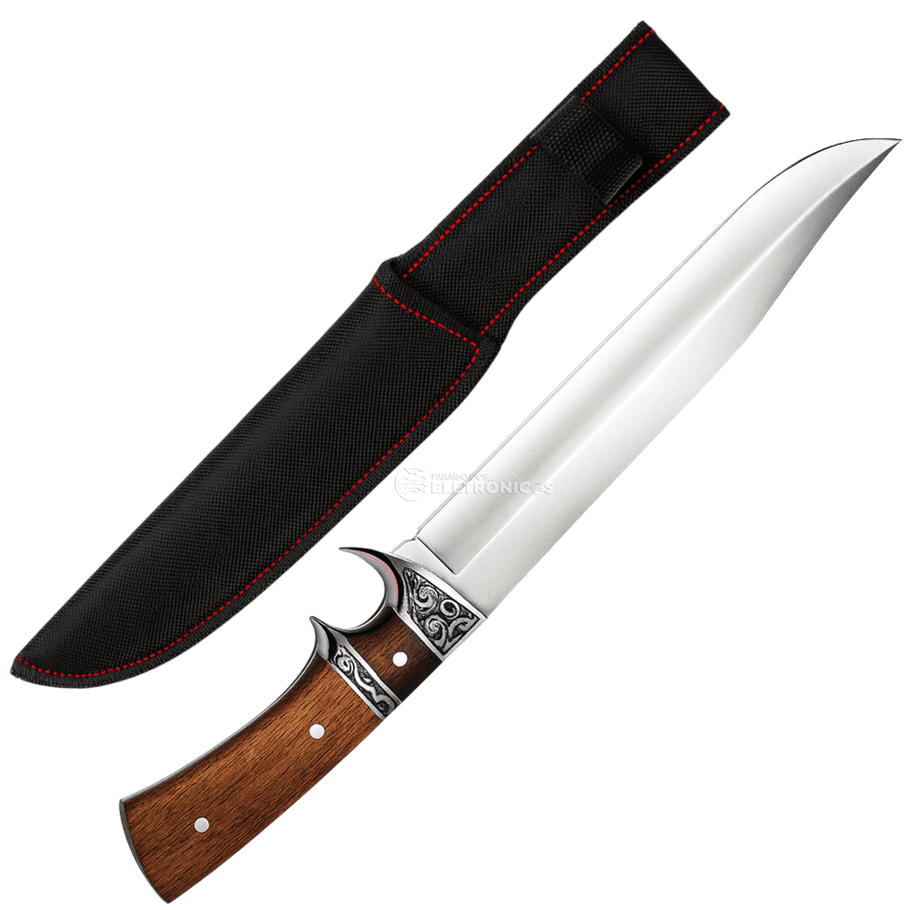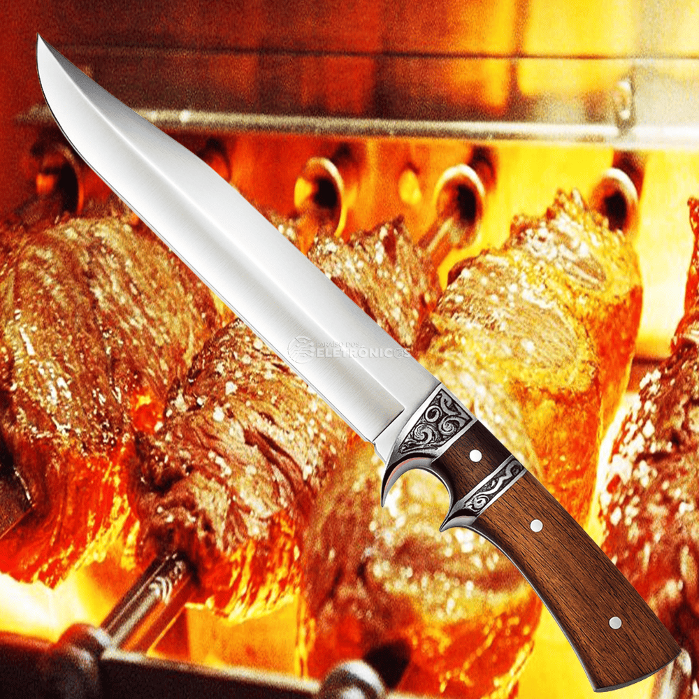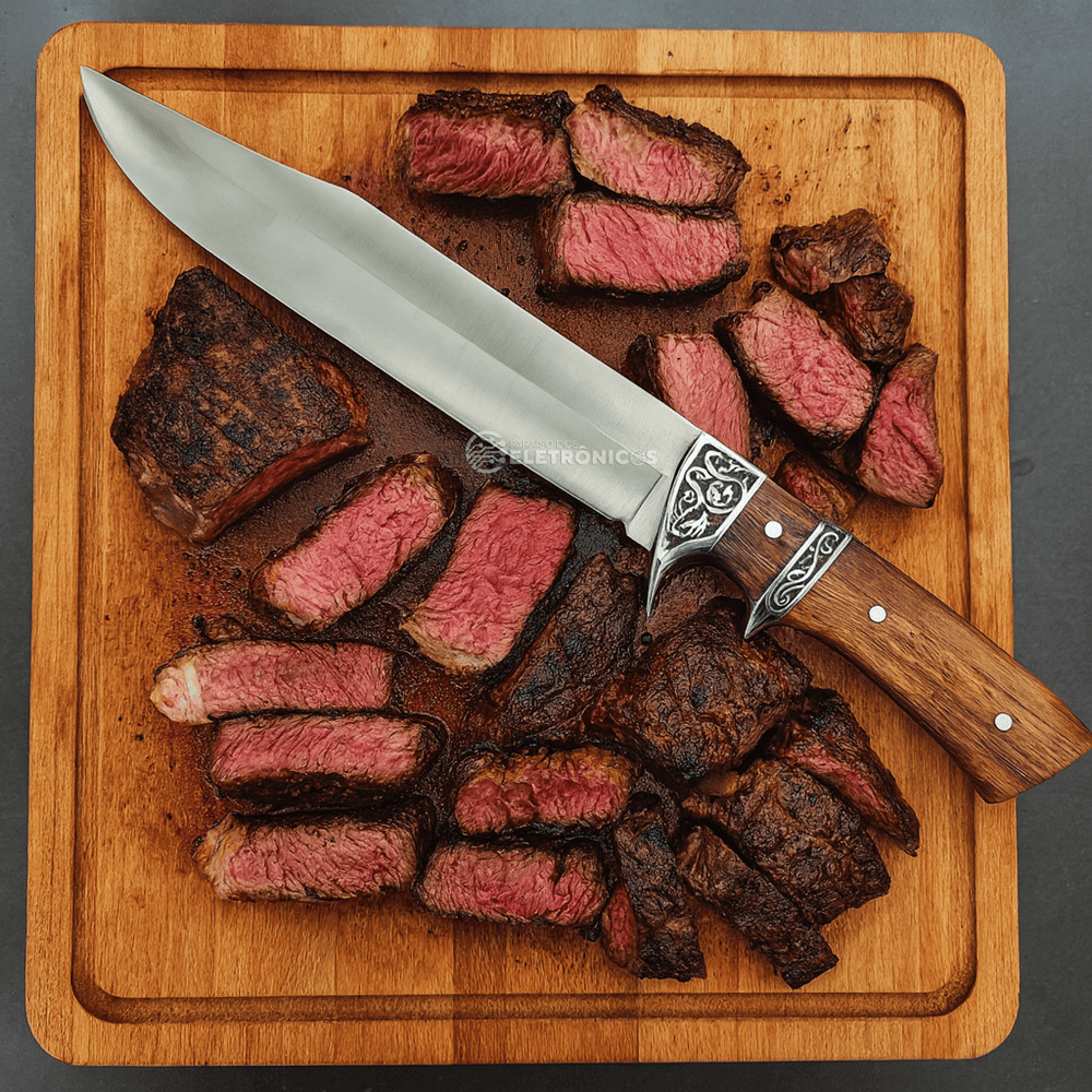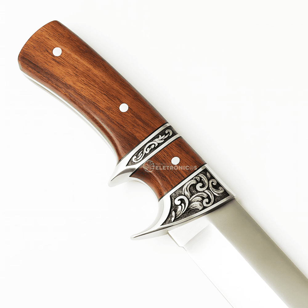 O cabo de aço e madeira, medindo 13 cm, proporciona firmeza, conforto e segurança no manuseio. O acabamento detalhado em metal agrega resistência e estilo, enquanto o sistema full tang garante equilíbrio e robustez, ideal para cortes contínuos em carnes, legumes e até alimentos mais resistentes.