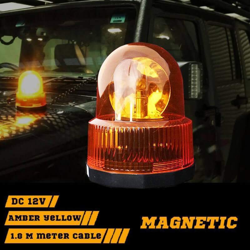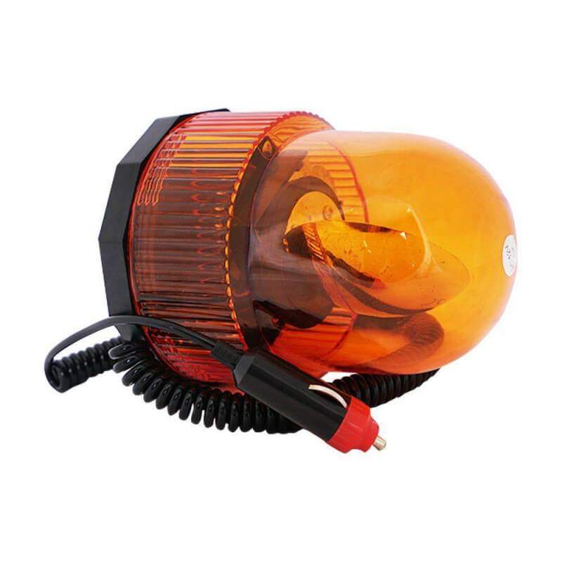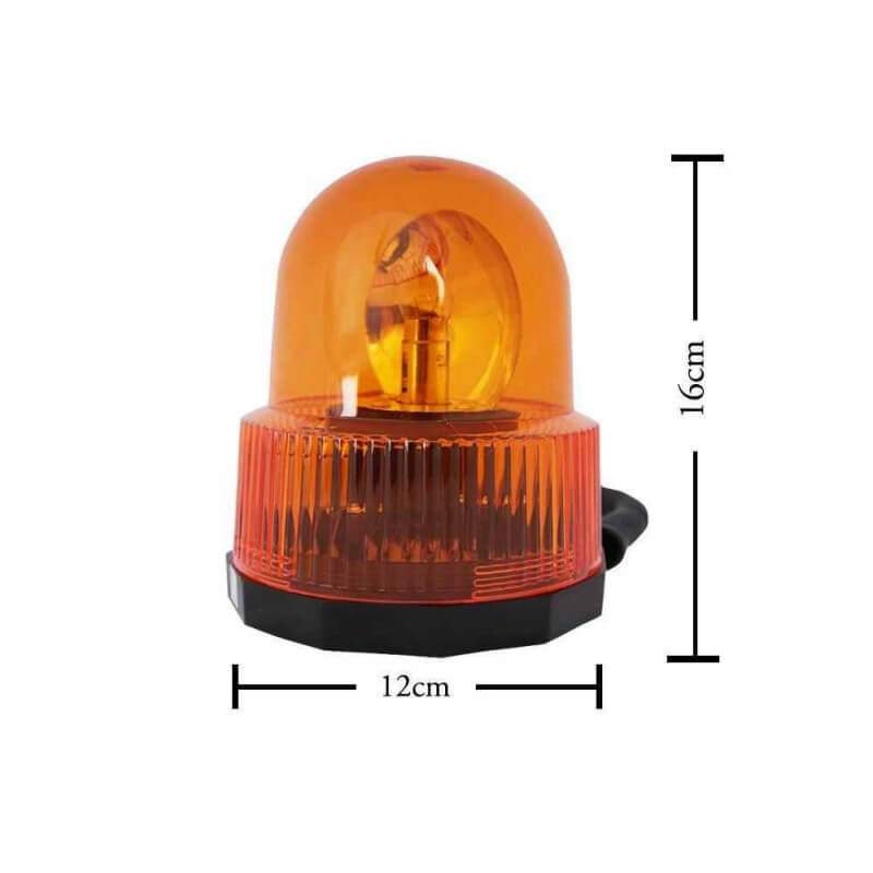 Este farol rotativo de 12v apresenta uma luz de cor âmbar colocada em uma plataforma rotativa, dentro de um recipiente de plástico.
