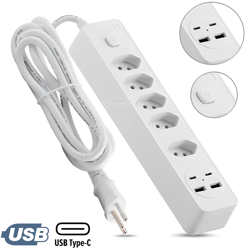 Operando em uma faixa de tensão de 100-250V, esta extensão é compatível com a maioria das redes elétricas, assegurando um funcionamento seguro e eficiente. Além disso, possui saída USB e Tipo C, permitindo o carregamento rápido e prático de smartphones, tablets, notebooks, câmeras e outros dispositivos que utilizam essas conexões.
