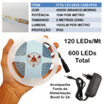 Fita LED 2835 Para Perfil Branco Morno 4000k 5 Metros Com 120 LEDs por metro 50w Adesivada Com Proteção IP20 Com Fonte