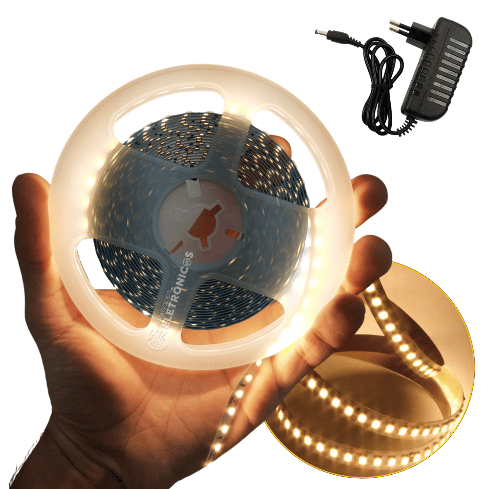 Fita LED 2835 Para Perfil Branco Quente 3000k 5 Metros Com 120 LEDs Por Metro 50w Adesivada Com Proteção IP20 Com Fonte