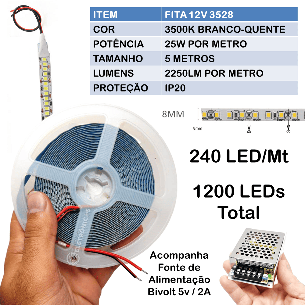 Tipo De LED: 3528 Rolo de 5 Metros Com 240 LEDs/m