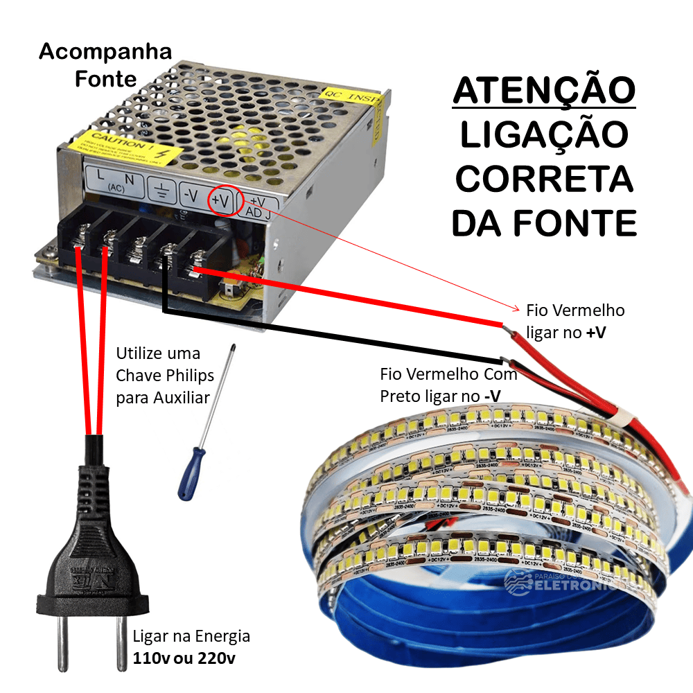 Além disso a fita LED possui linhas de corte a cada 5cm conforme indicado na própria fita para quê posso usar da melhor forma possível no seu projeto de instalação.