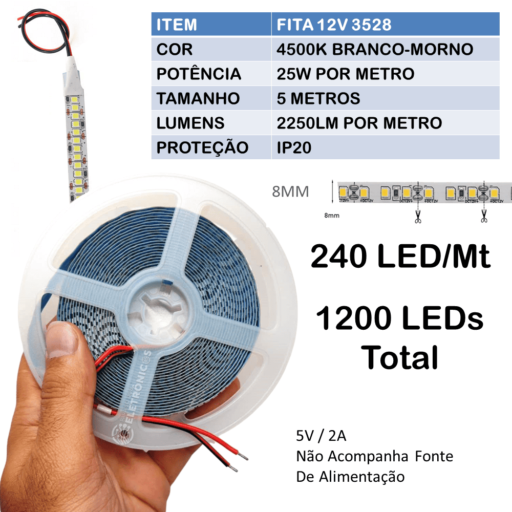 Tipo De LED: 3528 Rolo de 5 Metros Com 240 LEDs/m