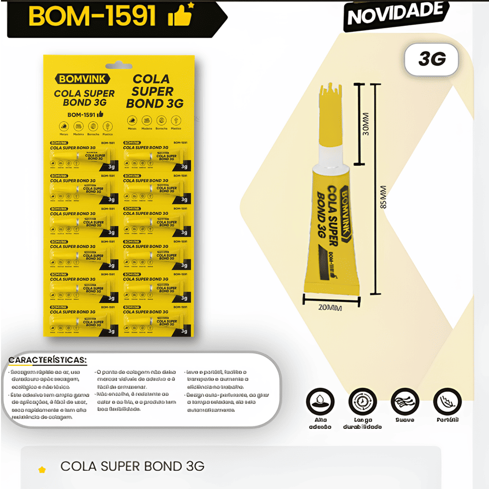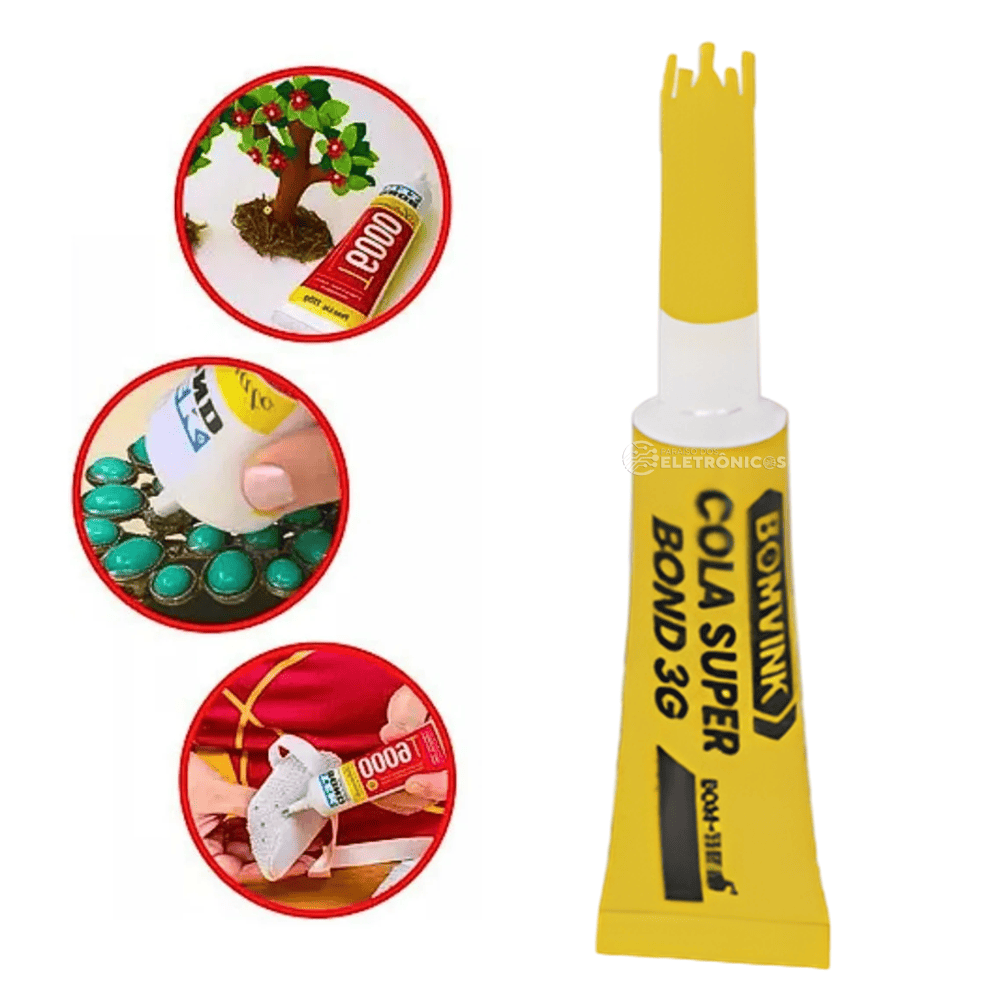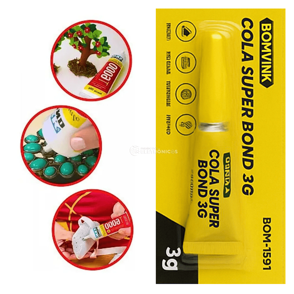 Perfeita para reparos domésticos, artesanato, papelaria e pequenos consertos em geral, a cola proporciona secagem rápida e aderência forte em diversos materiais como plástico, madeira, borracha, metal e cerâmica.