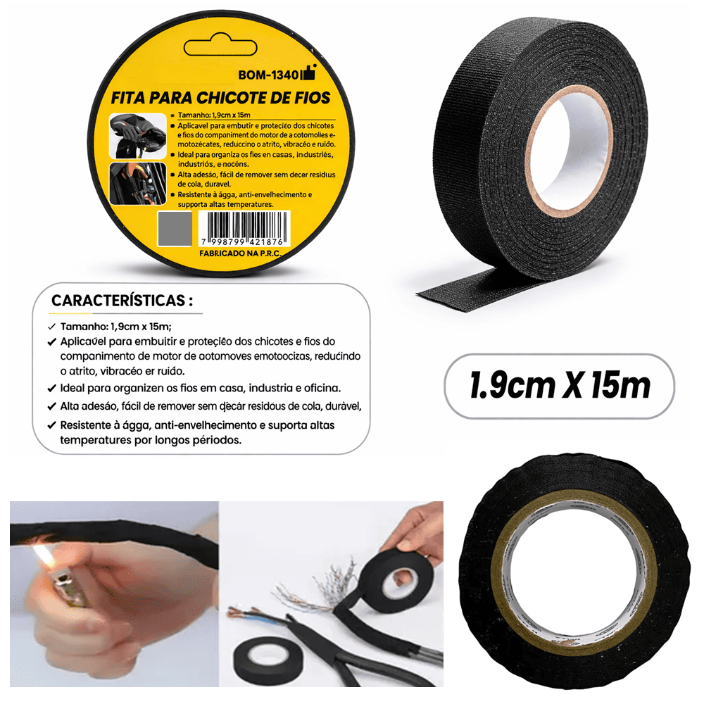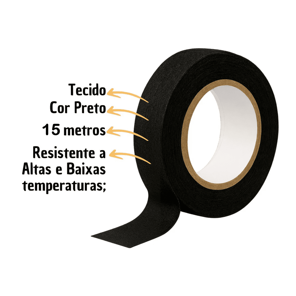 Com largura de 1,9 cm e comprimento de 15 metros, essa fita é perfeita para embutir e organizar chicotes de fios em carros, motos, equipamentos industriais e projetos domésticos. Sua alta aderência permite fixação firme, sem soltar com o tempo, além de ser fácil de remover sem deixar resíduos de cola, preservando os cabos e superfícies.