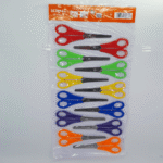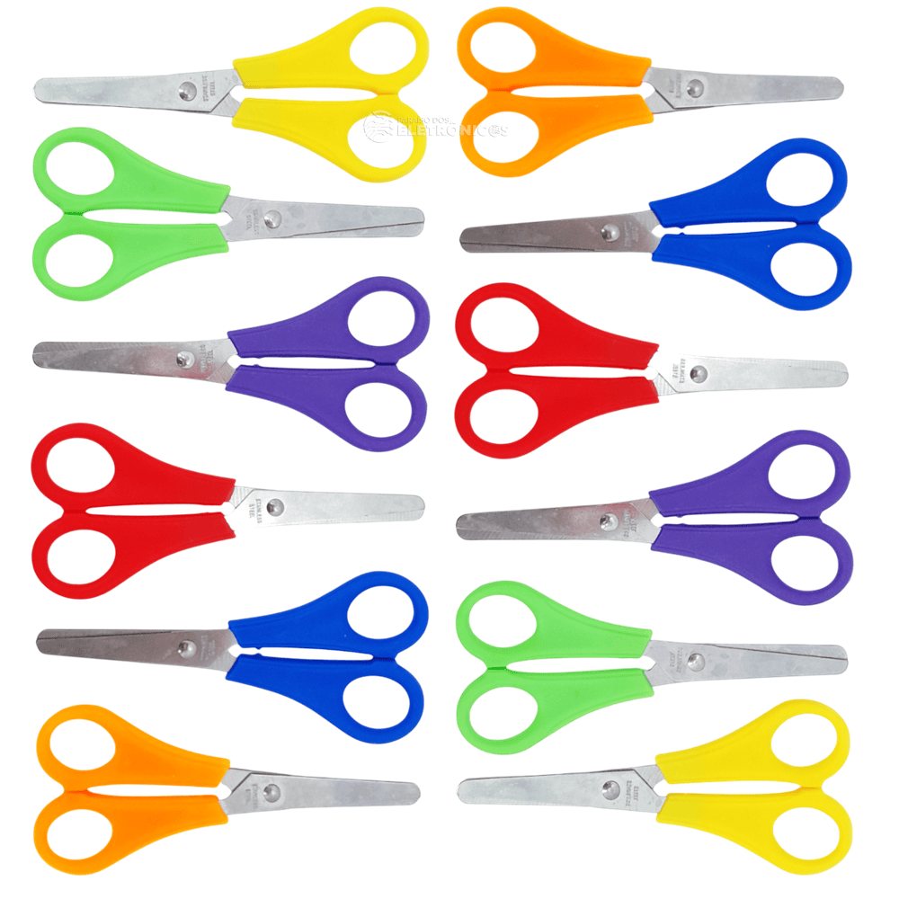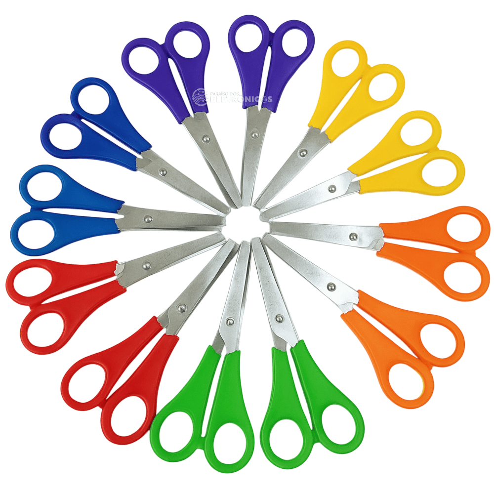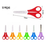 Kit com 12 tesouras coloridas sem ponta. É perfeita para todas as tarefas escolares e artísticas. Seu design ergonômico e cores vibrantes tornam o corte fácil e divertido. Ideal para alunos de todas as idades! Podendo ser utilizada também em uso geral doméstico. Produto leve, com 13cm de comprimento e durável.